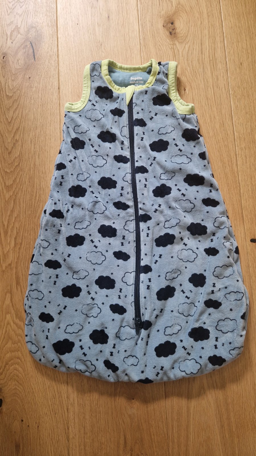 Spací vak pre bábätko s bavlnenou podšívkou a dlhým zipsom pre ľahšie obliekanie a vyzliekanie. Používaný, stále vo veľmi dobrom stave, len pár vnútorných švov som prešila, lebo sa používaním uvoľn...