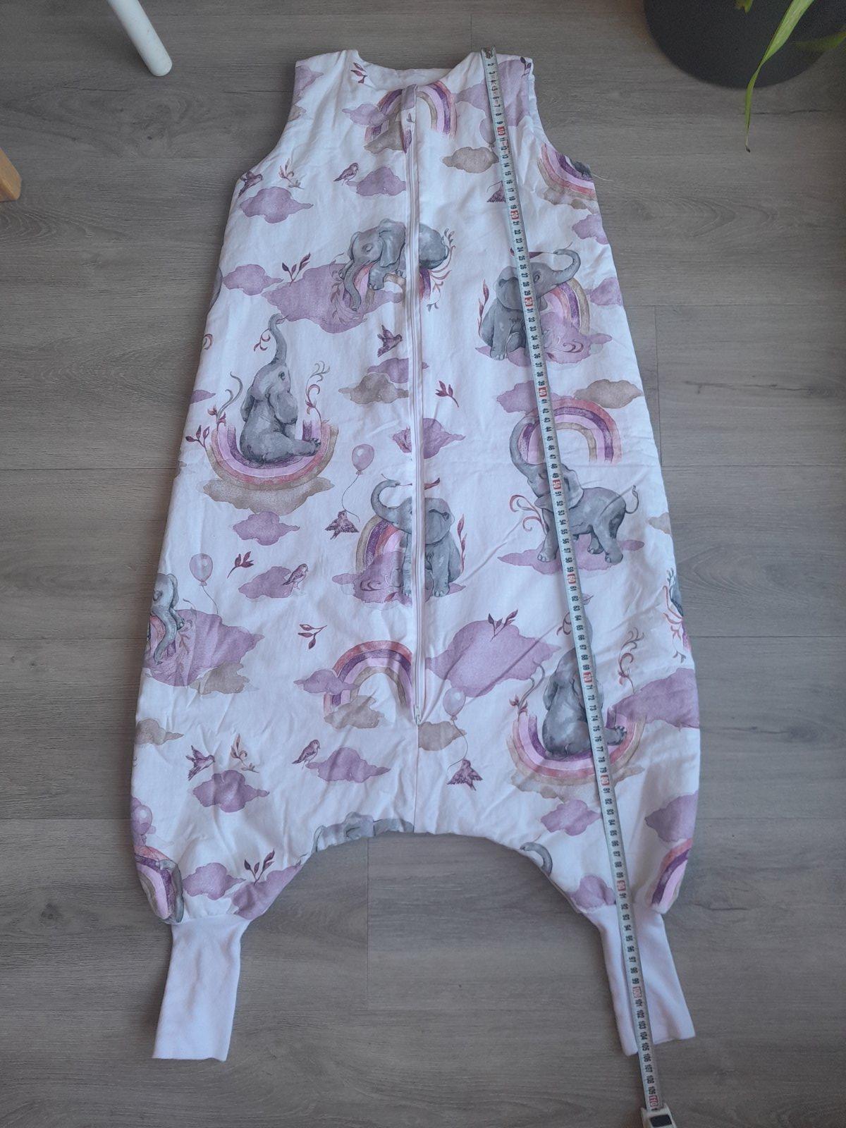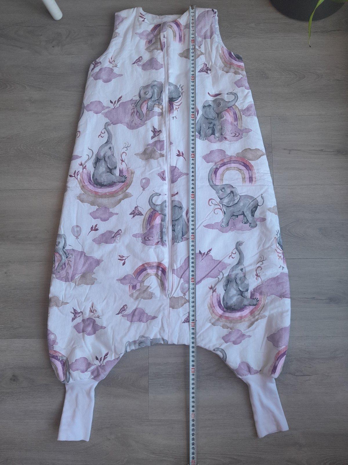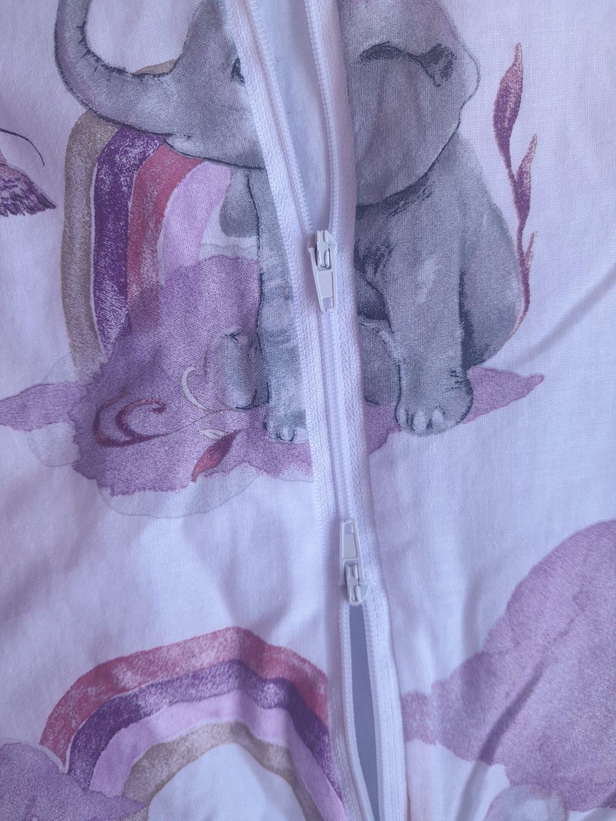 Predam spaci vak velkost L, pre cca 4 - 6 rocne dieta. Je zatepleny, vhodny na prechodne obdobie a na zimu. Ma krasnu potlac, slonikov a duhy, obojstranny zips, predlzene manzety na nohach. Rozmery su uvedene na fotkach.