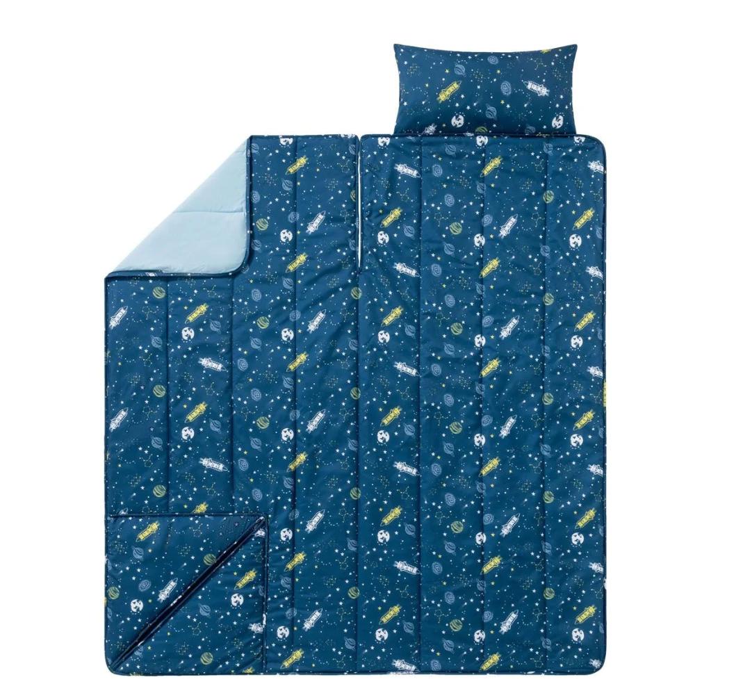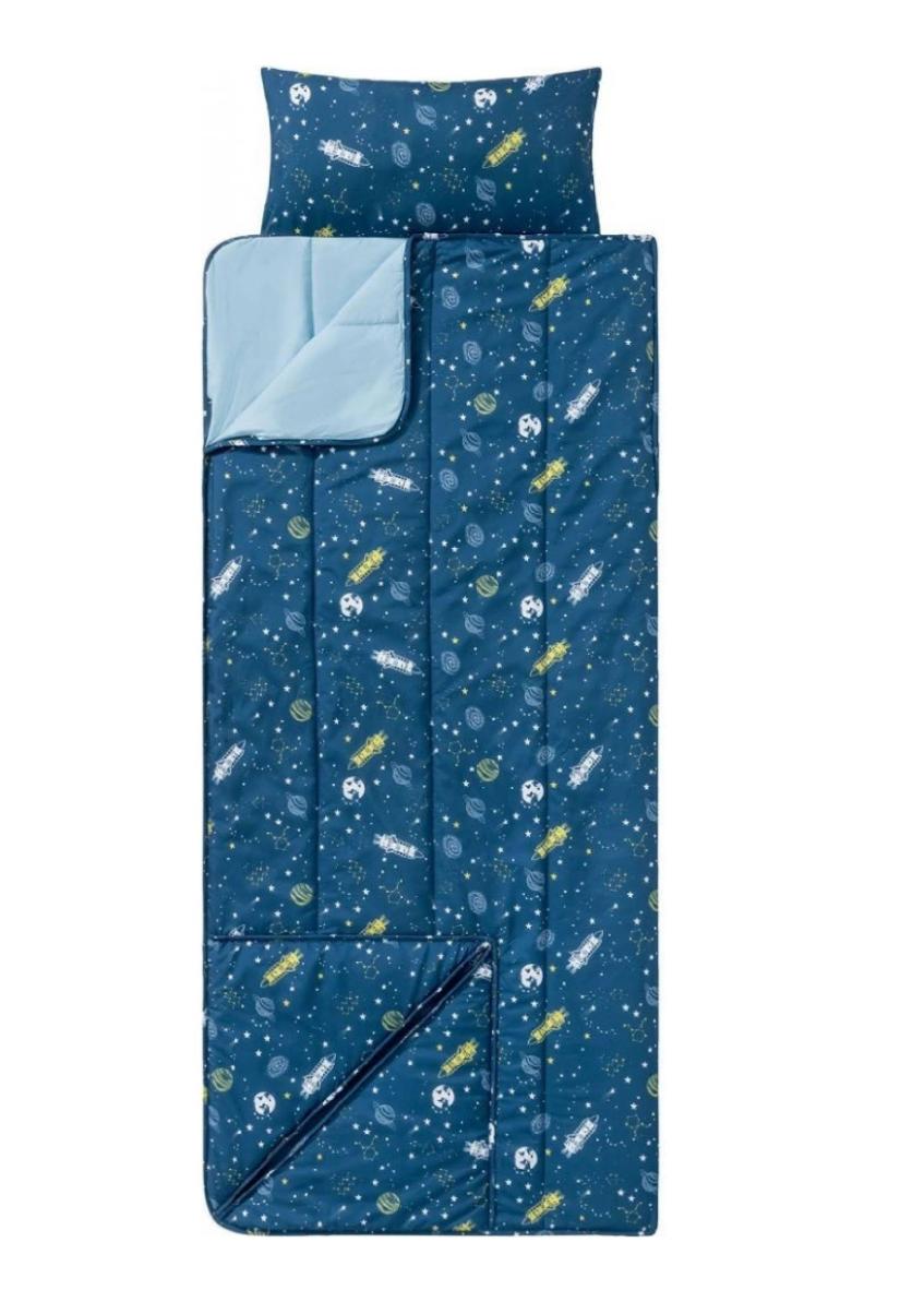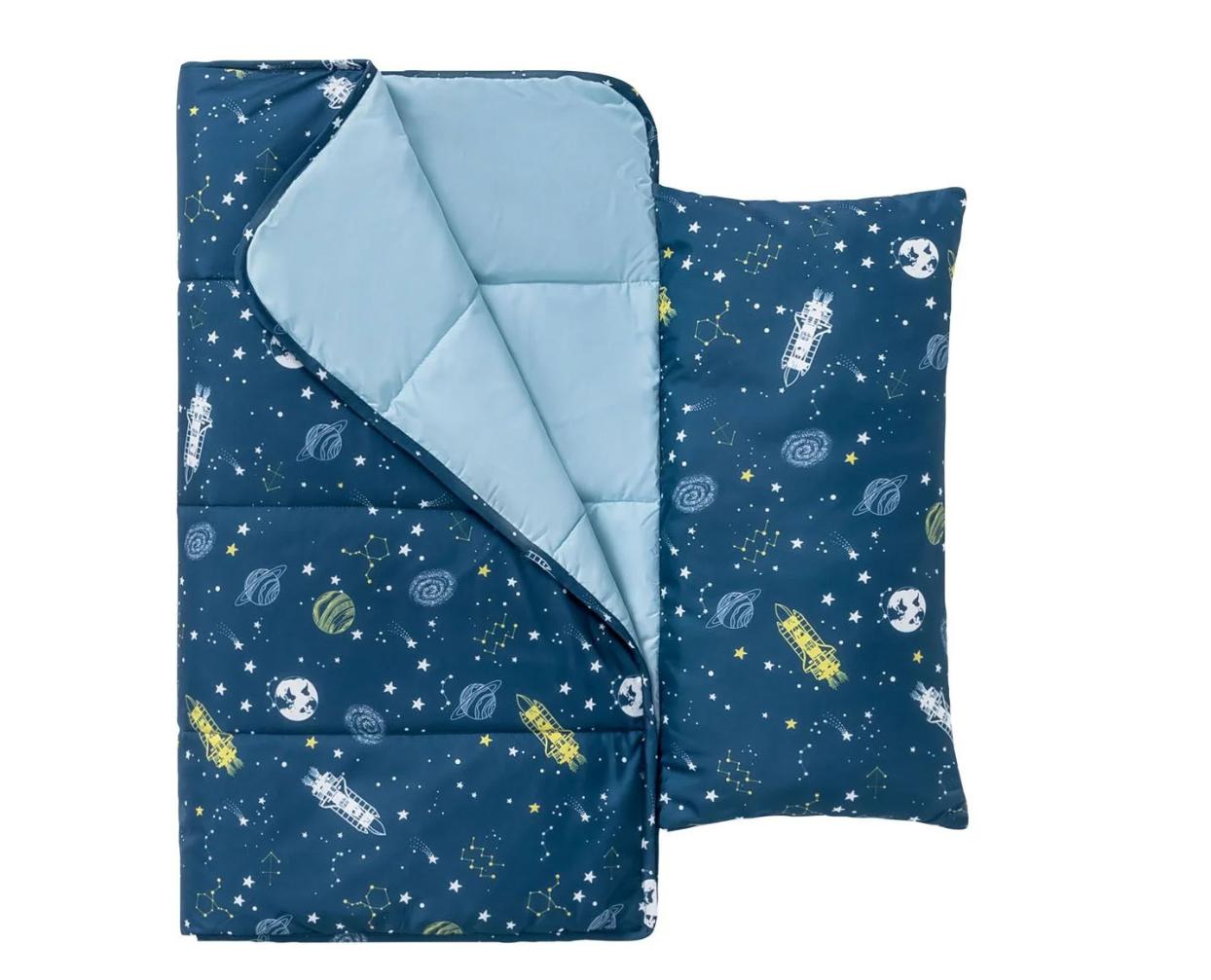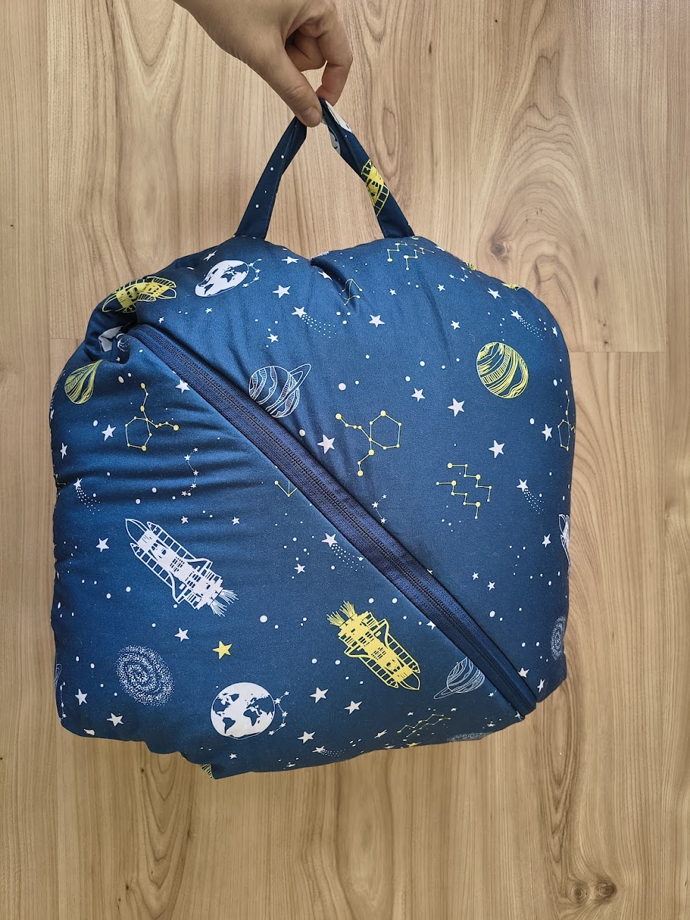 Detská posteľná súprava 3v1, zložiteľná do praktickej tašky s úchytom, s potlačou vesmíru. Bola použitá asi 3x, nepoškodená, výborný stav. Je to vlastne spací vak s malým vankúšom, ideálny na dlhé cesty autom alebo lietadlom, stanovanie, na chaty....