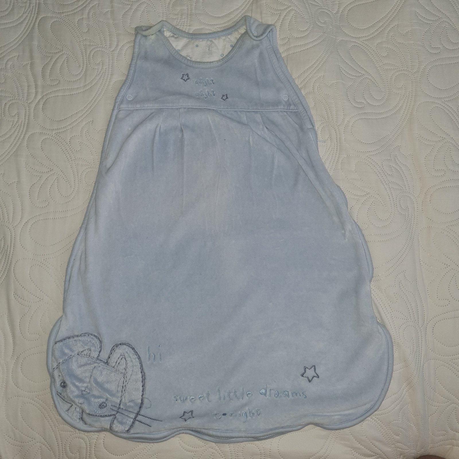 Používany stav , má vybledmuté miesta kde tu, ale plne funkčný, veľkost uvedena 6-12 mes.