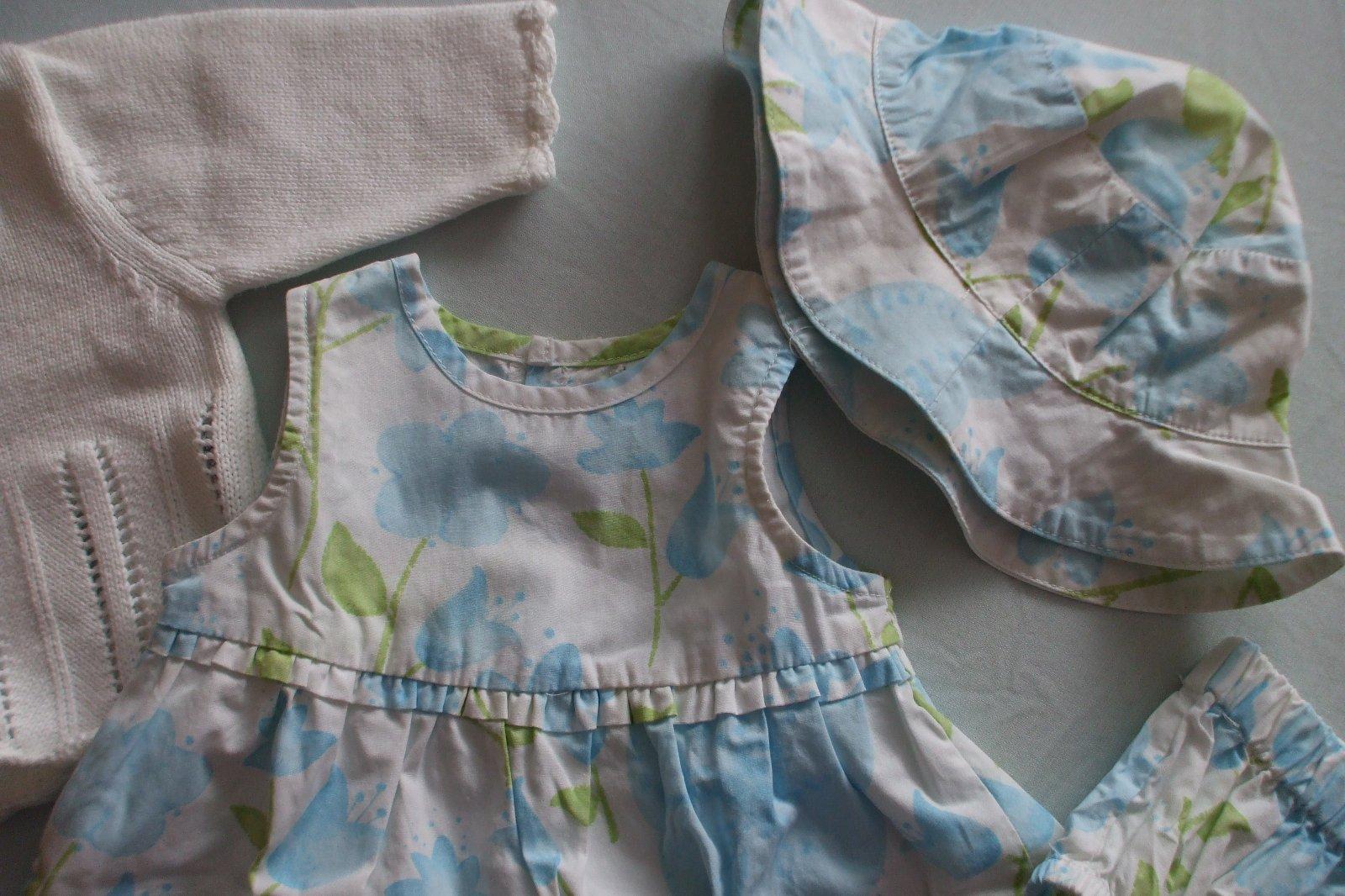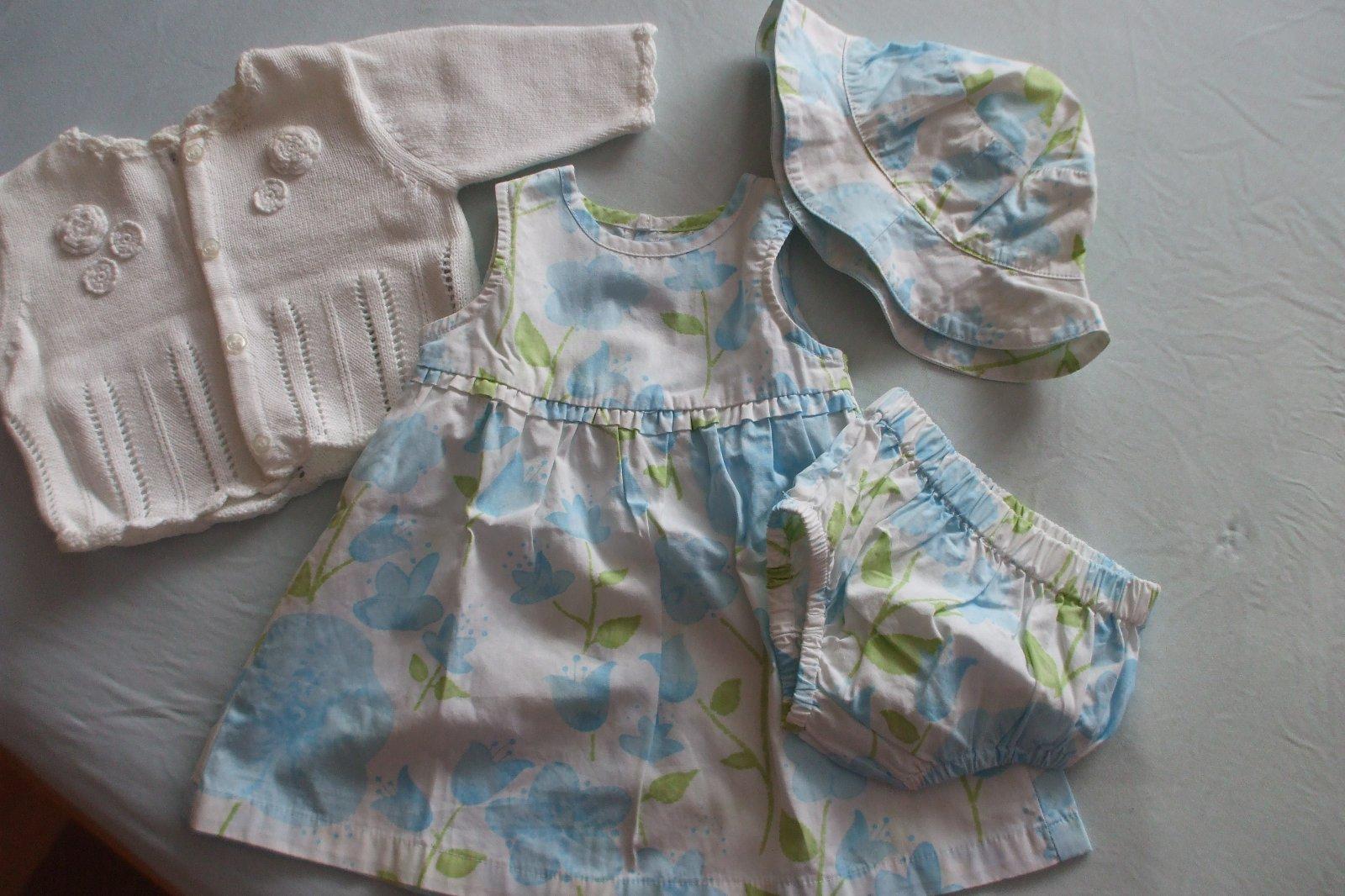 Nenosený iba opraný kompletík pre malú slečnu. Šatočky, klobúčik a gaťuše na plienku. Pekne k nim pasuje svetrík - bolerko od Nextu, to bolo nosené. Cena spolu.