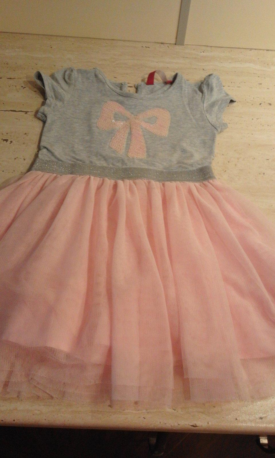 Šedé šatočky s ružovou tutu sukničkou, vpredu zdobené flitrovanou ružovou mašličkou, na zadnom diely zapínanie na jeden gombíček, veľmi pohodlné, na bežné nosenie, či tanečný krúžok. Vo veľmi dobrom stave. K dispozícií dva rovnaké kusy (napr. pre dvojčatá). Cena za 1 kus.