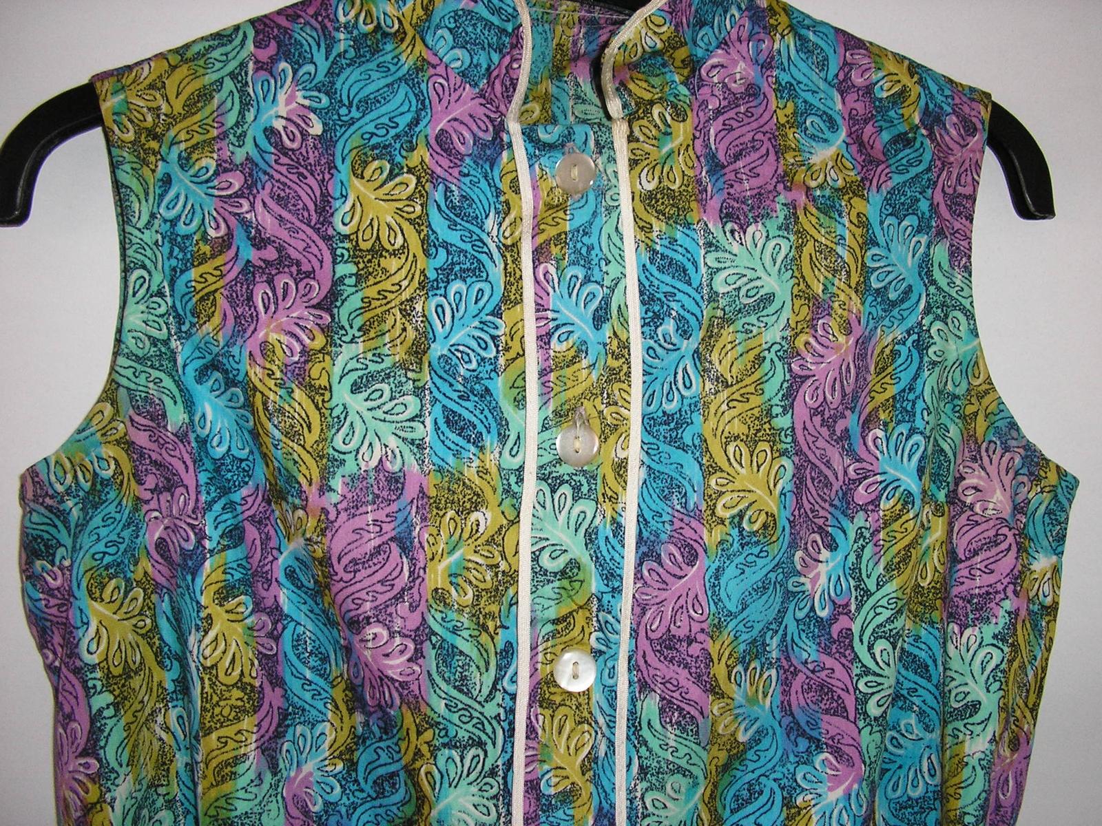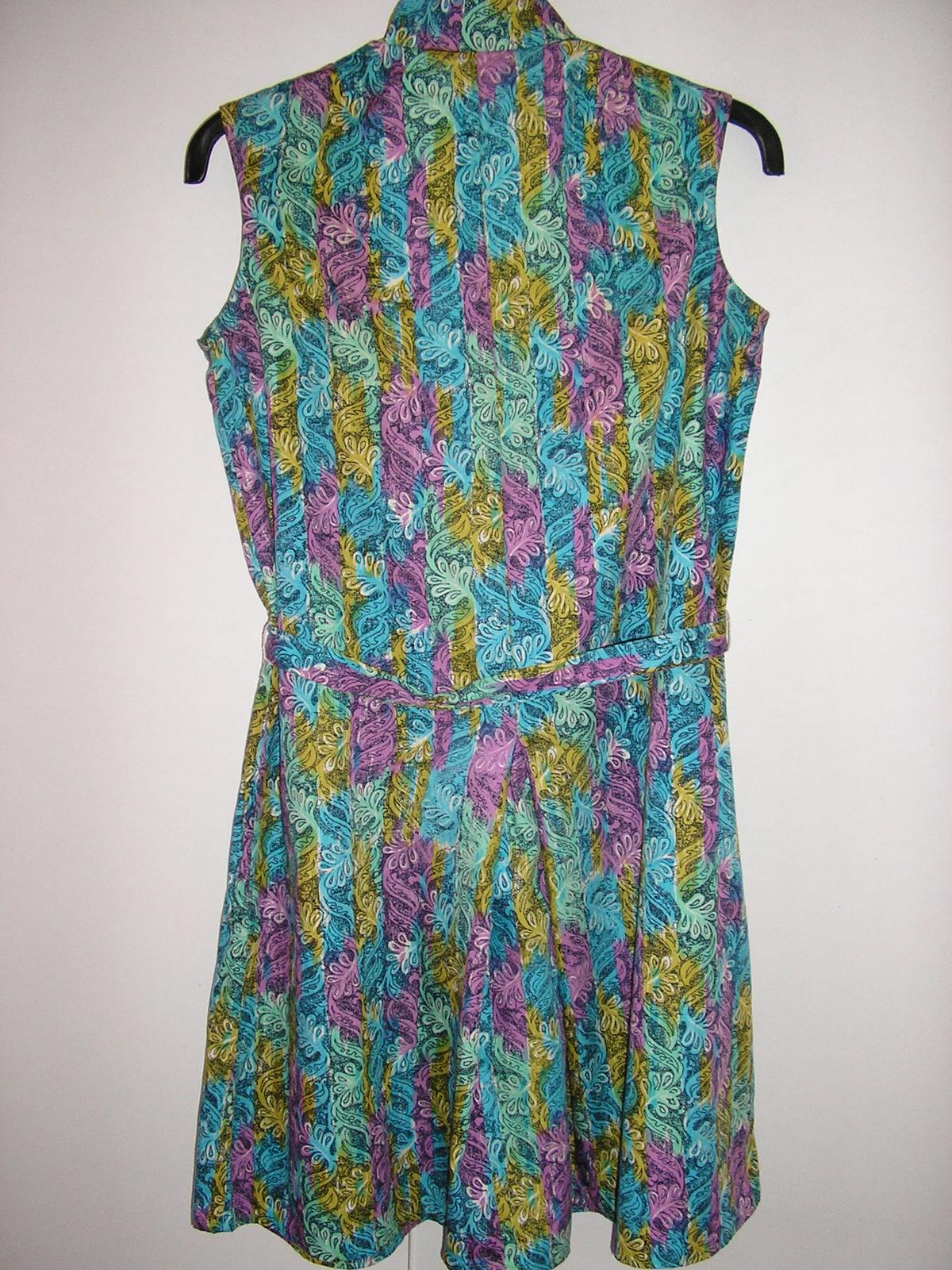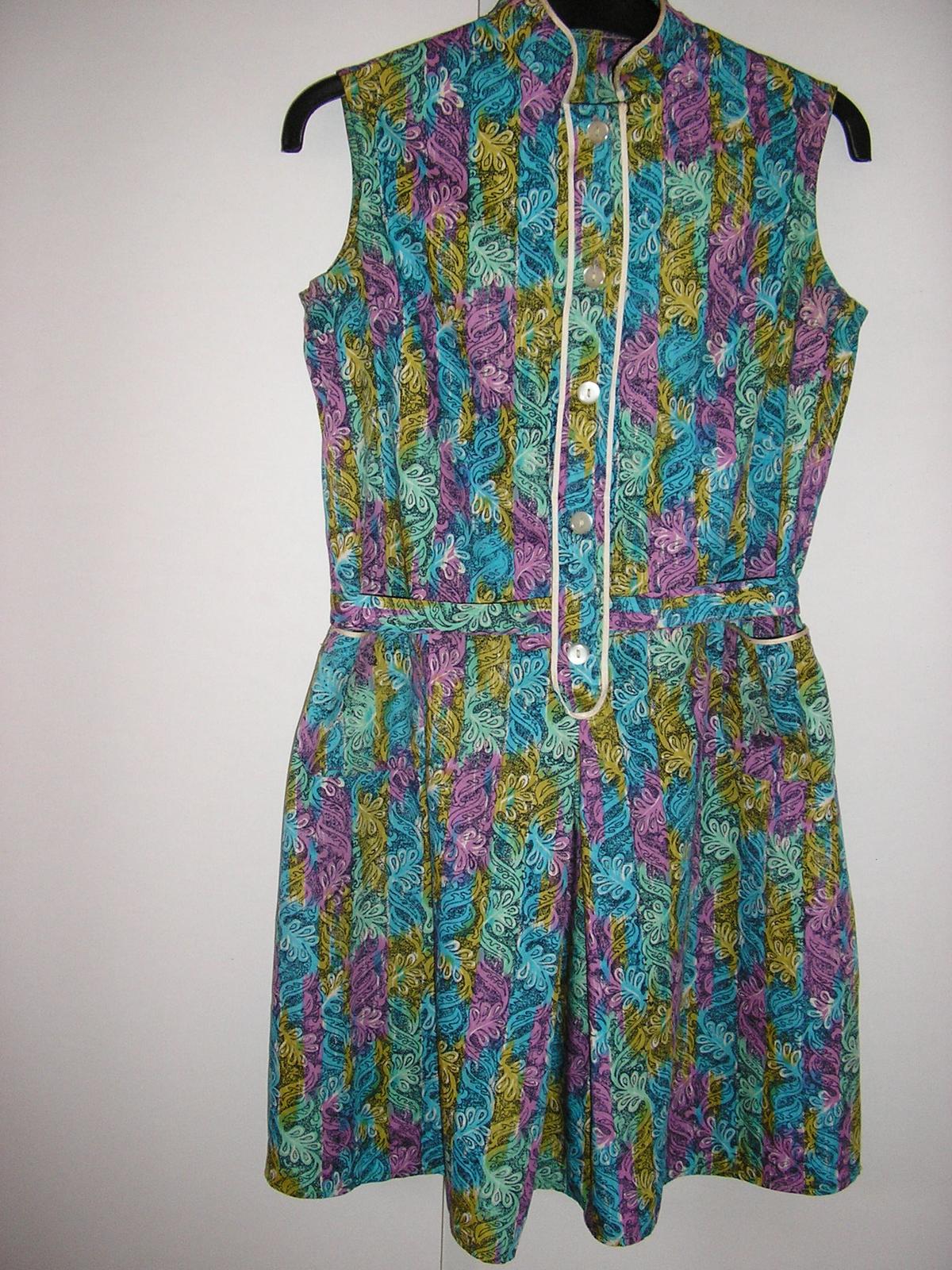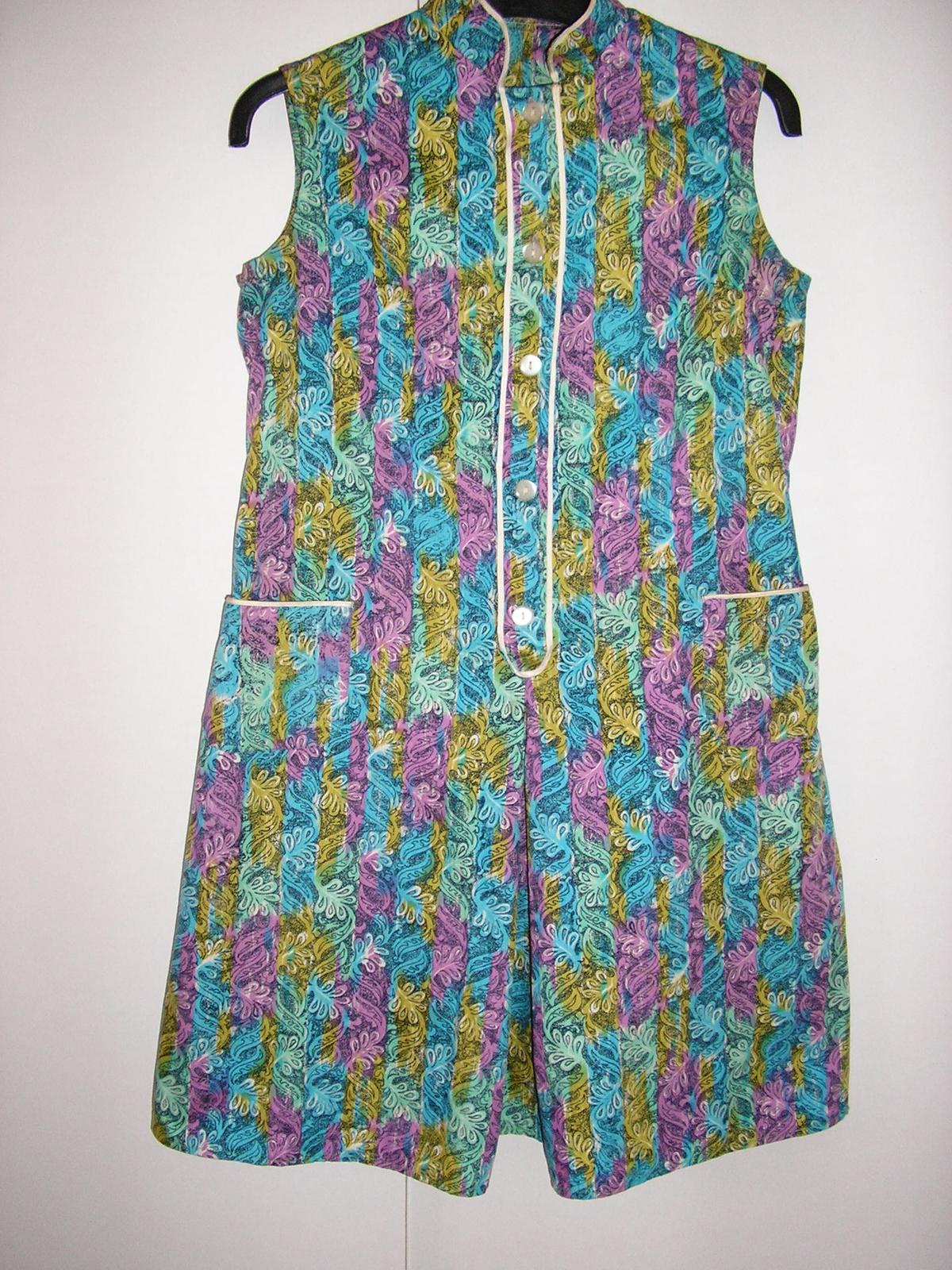 Šaty sú bez rukávov. Strih rovný, mierne rozšírený. Ruský golier olemovaný spolu s gom. leg. – bielou farbou. Možnosť nosenia s opaskom. Vpredu sú 2 vrecká.