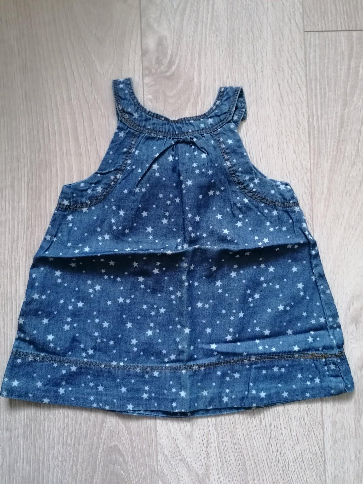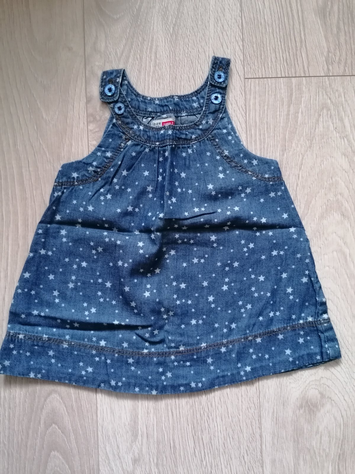 makkulinka riflovinka s motivom hviezdiciek, uvedena velkost 62, my sme nosili ako tuniku, ked mala 1r a 2r. ako nove, oblecene parkrat. celkova dlzka s ramienkami 39 cm (nastavitelne na 2 dlzky), sirka 28.5 cm. postovne podla cennika posty