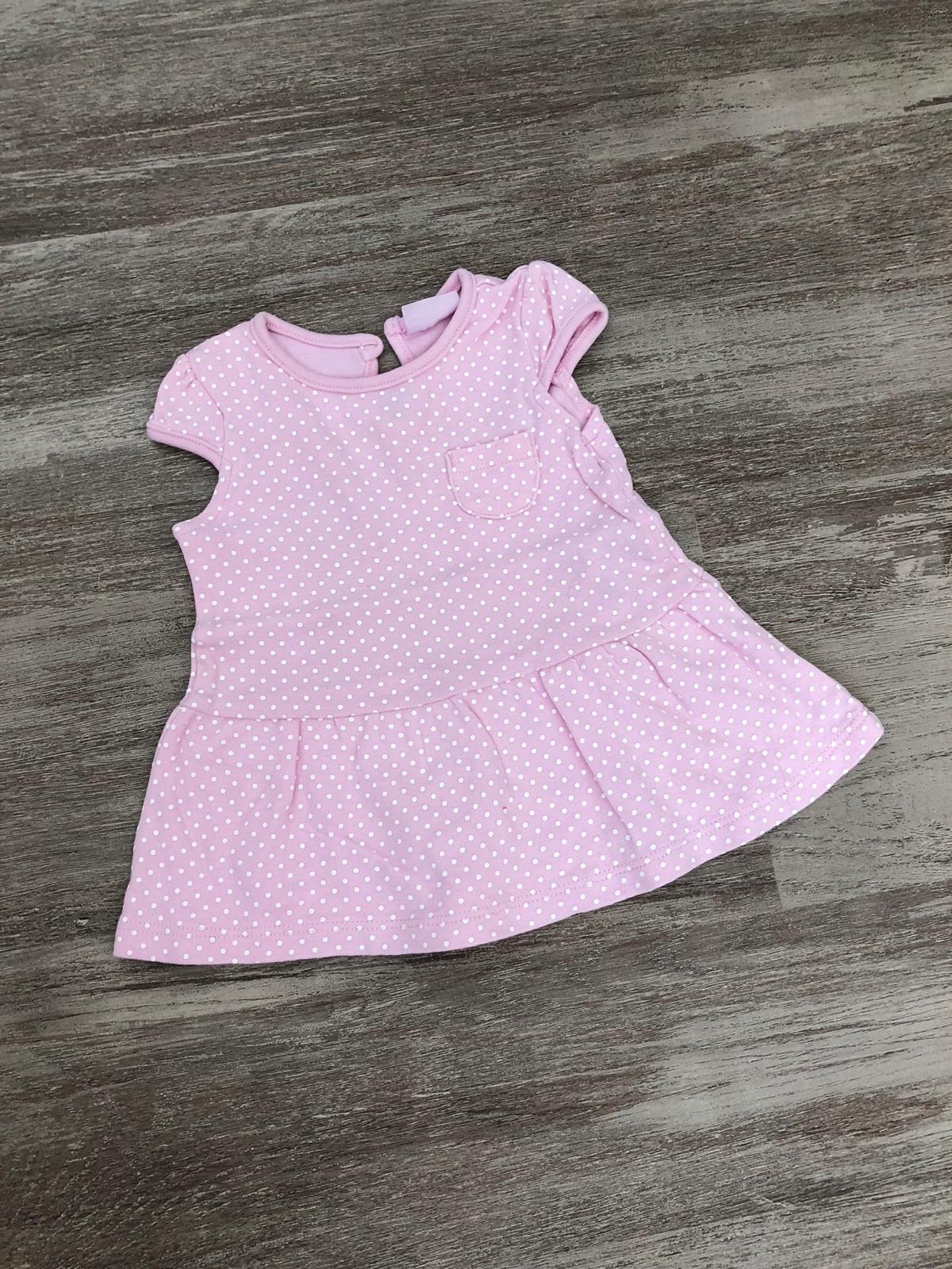 Prané asi 3x- top stav. Vpredu na 3 gombíky, sukňa z 3 vrstiev rôznej dĺžky. Svetloružová farba s malými bielymi bodkami o priemere 3 mm. Rozmery: ramená 21 cm, šírka 27 cm. dĺžka 42 cm.