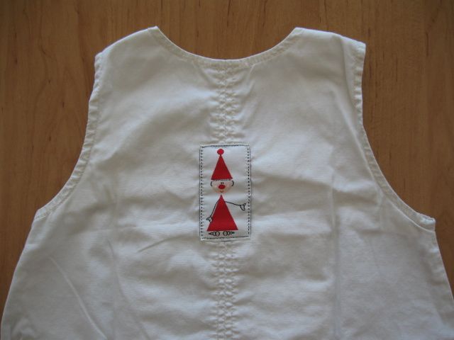 - nosené len Emmi, sú ľahučké. Na prednom dieli je vrecko a na pleciach sa zapínajú na cvoky. Na spodnom okraji šiat je po bokoch gumka. Na zadnom diele ja nášivka s panáčikom. Šaty sú smotanovej farby.
