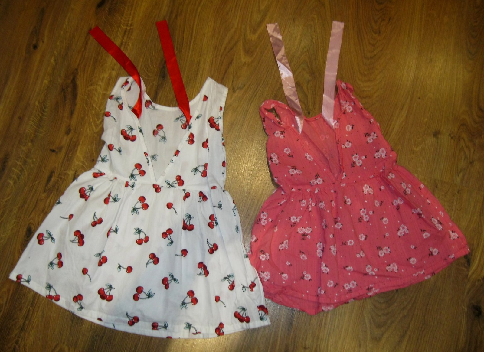 predám tenké letné šaty, vzadu na zaviazanie mašľou tú som tam našívala, čerešničkové dĺžka 54 cm, margarétkové dĺžka 49 cm, v top nosenom stave, veľ. 98/104