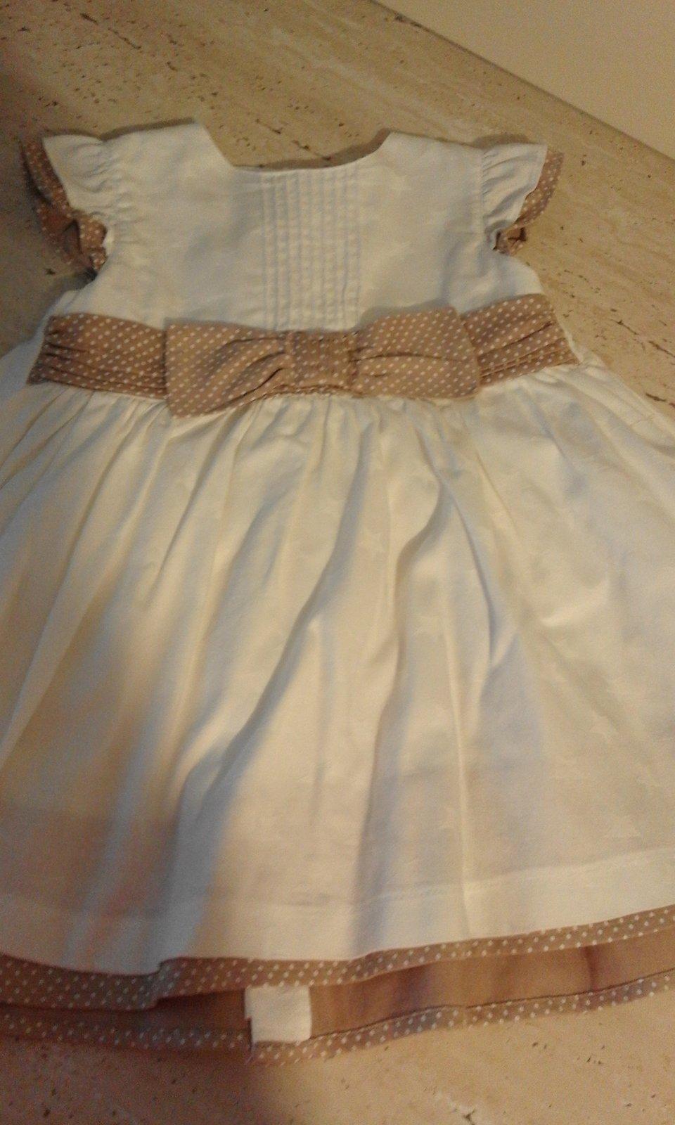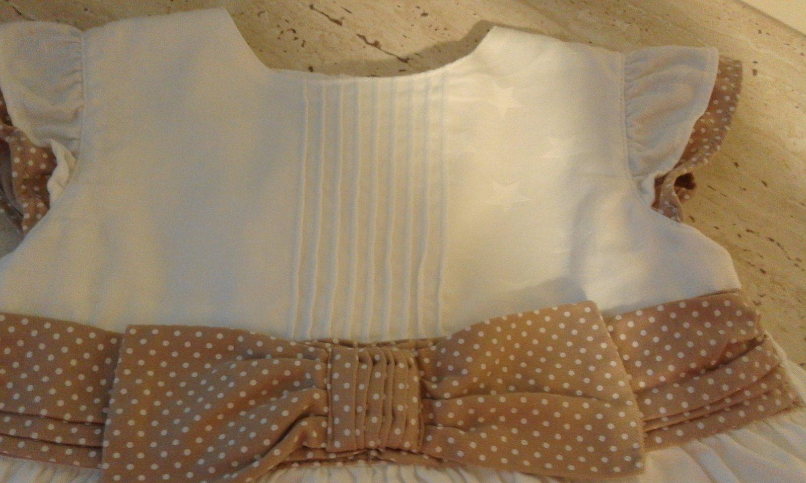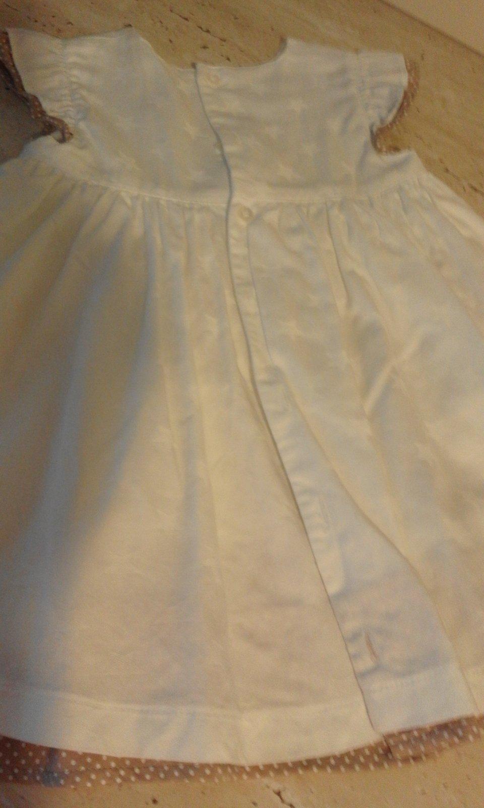 Dievčenské letné biele šatočky s potlačou bielych hviezdičiek, svetlohnedá mašľa a svetlohnedé olemovanie, vzadu na zapínanie. Pohodlné a vo veľmi dobrom stave.