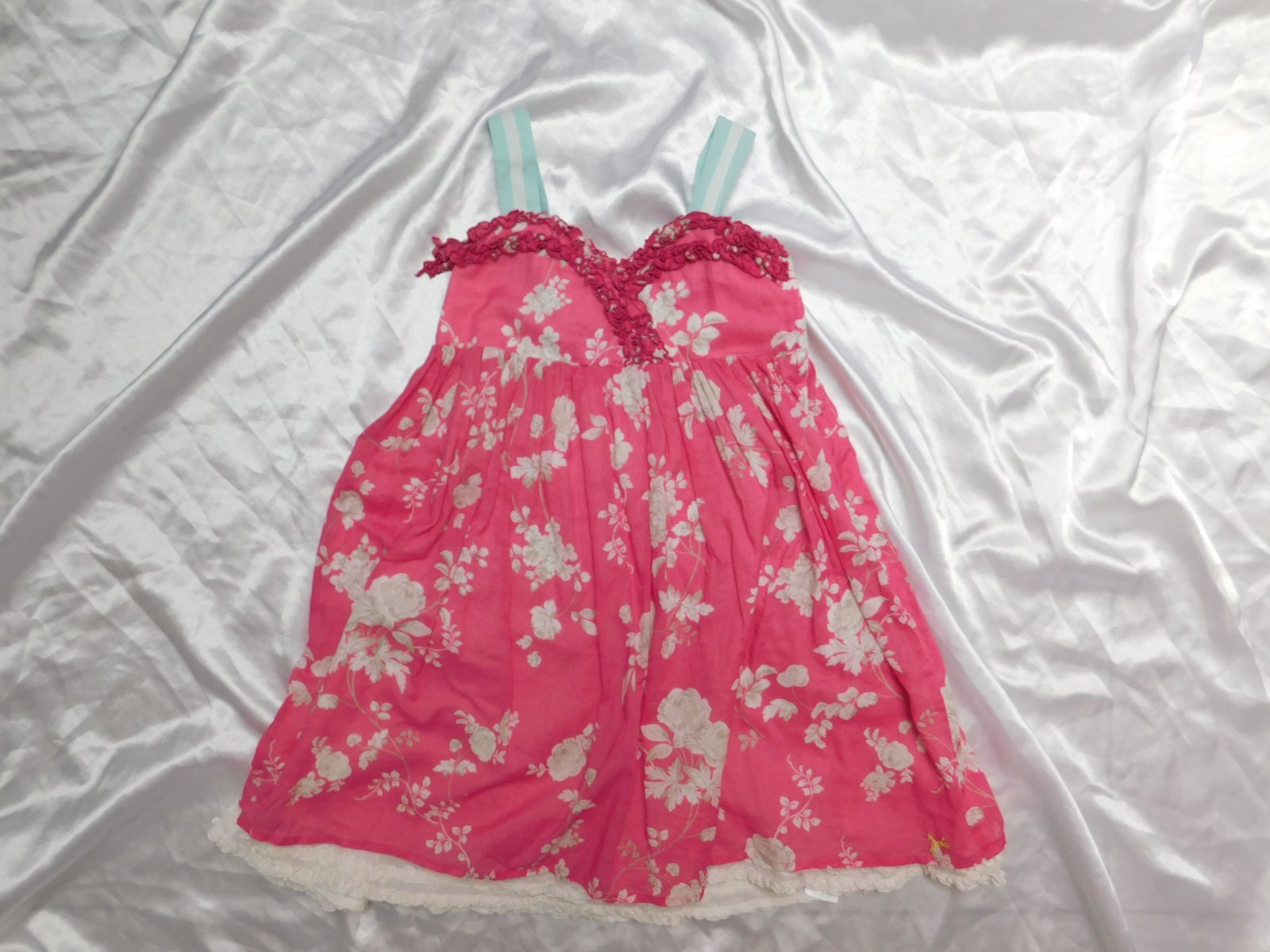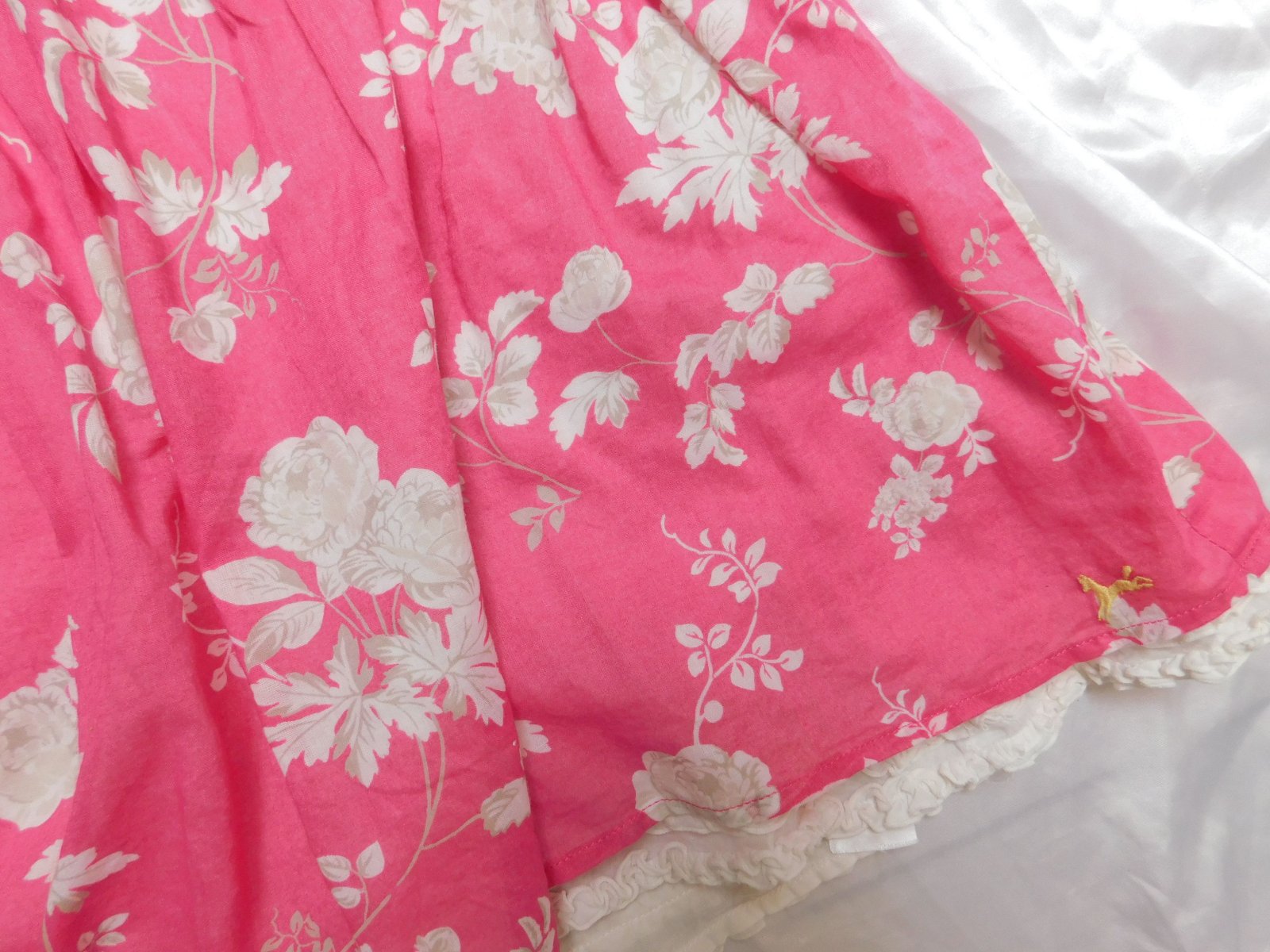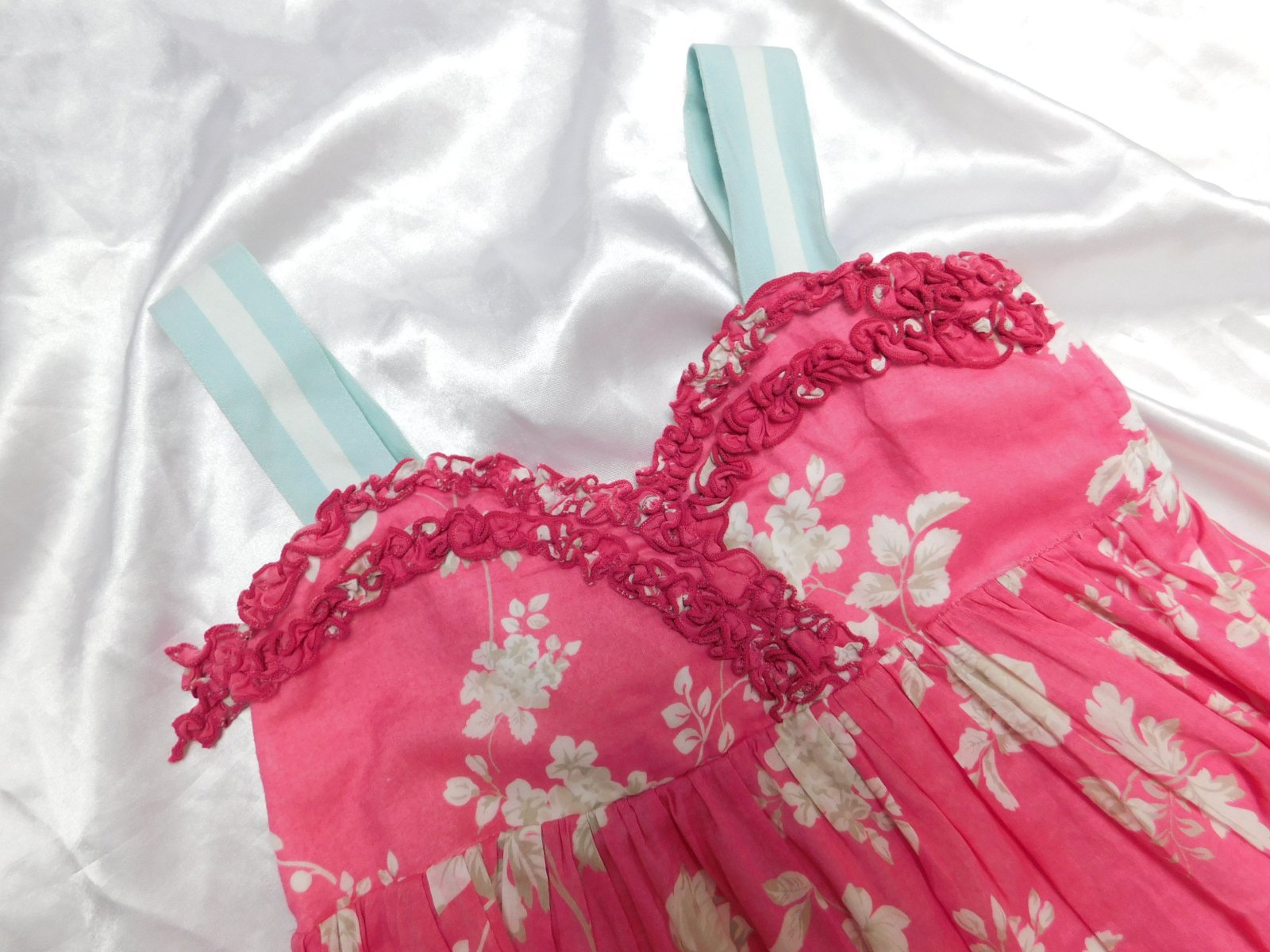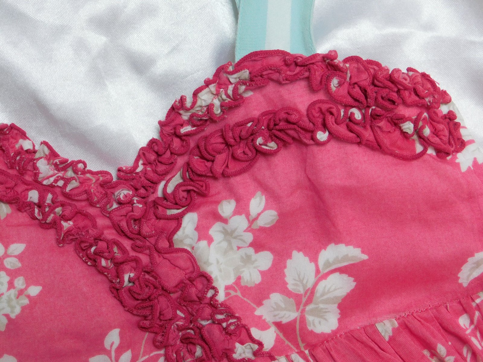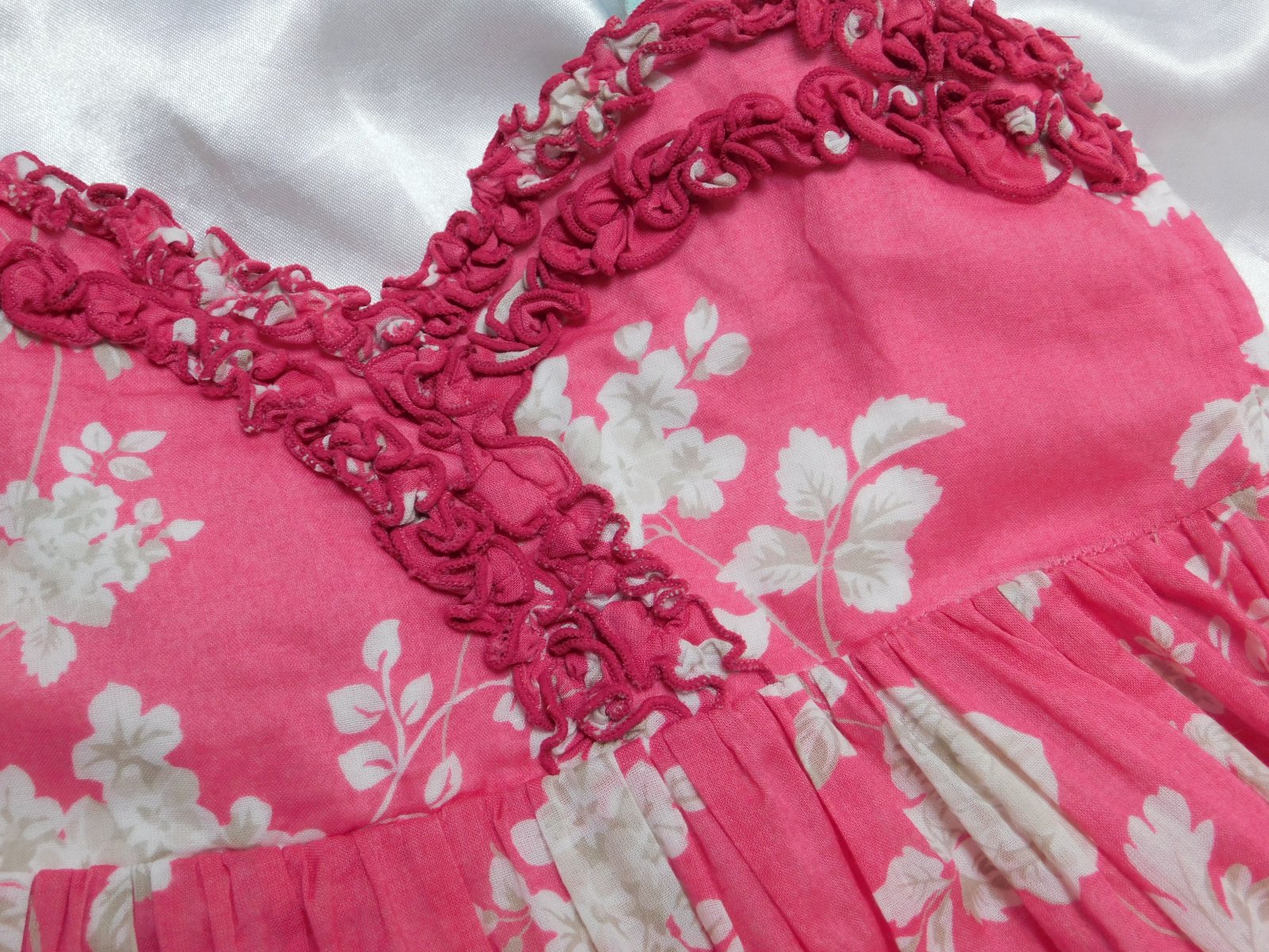 Párkrát oblečené šatky so spodničkou. Vrch bavlna, v páse gumička, sukňa satén s vyšívanými srdiečkami, spodnička tyl. Veľmi dobrý stav...