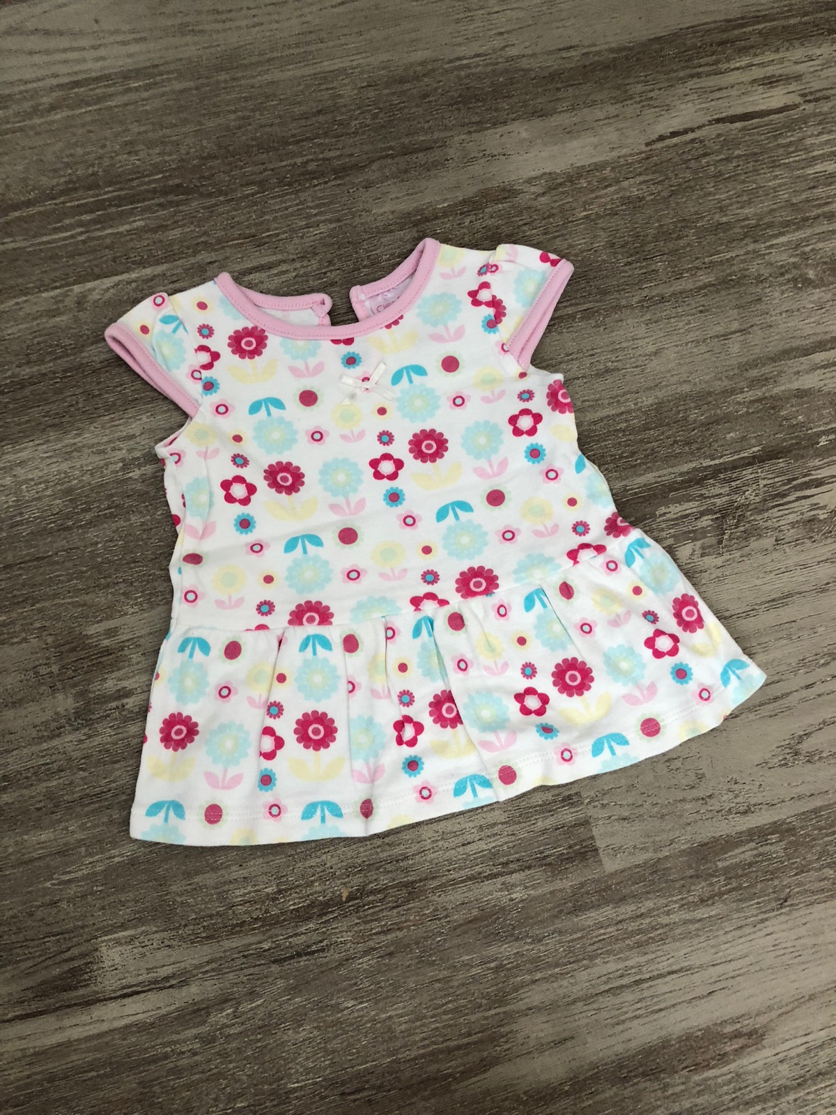 Prané asi 3x- top stav. Vpredu na 3 gombíky, sukňa z 3 vrstiev rôznej dĺžky. Svetloružová farba s malými bielymi bodkami o priemere 3 mm. Rozmery: ramená 21 cm, šírka 27 cm. dĺžka 42 cm.