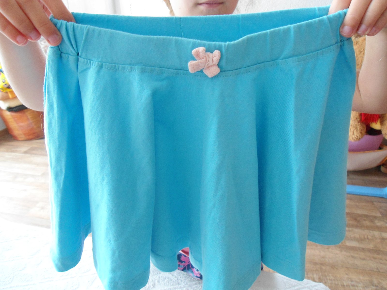krásna bledomodrá suknička asi raz použitá + ružové bodkované kraťasky veľkosť 98/104. Vhodné tiež na prázdniny k babke