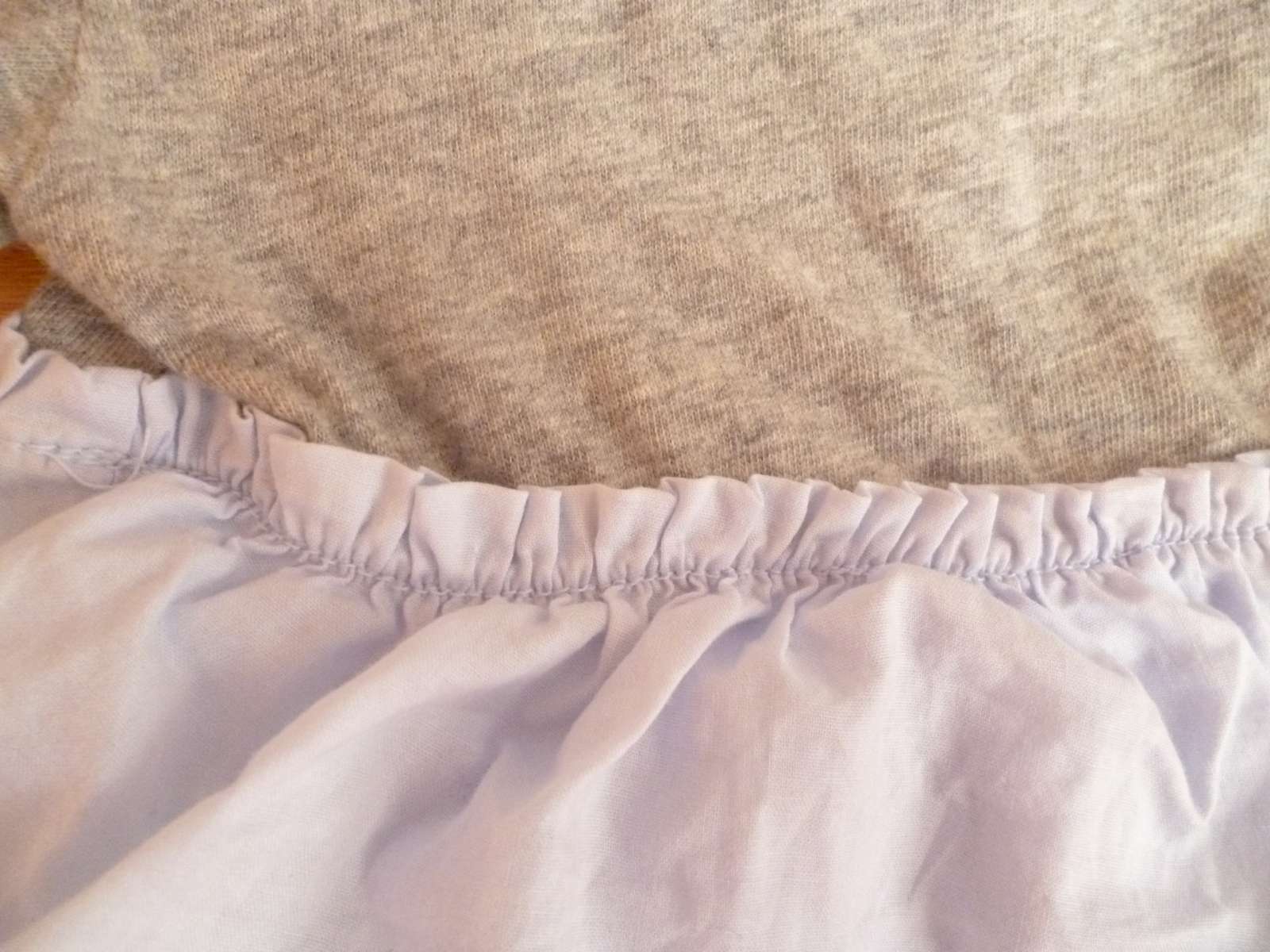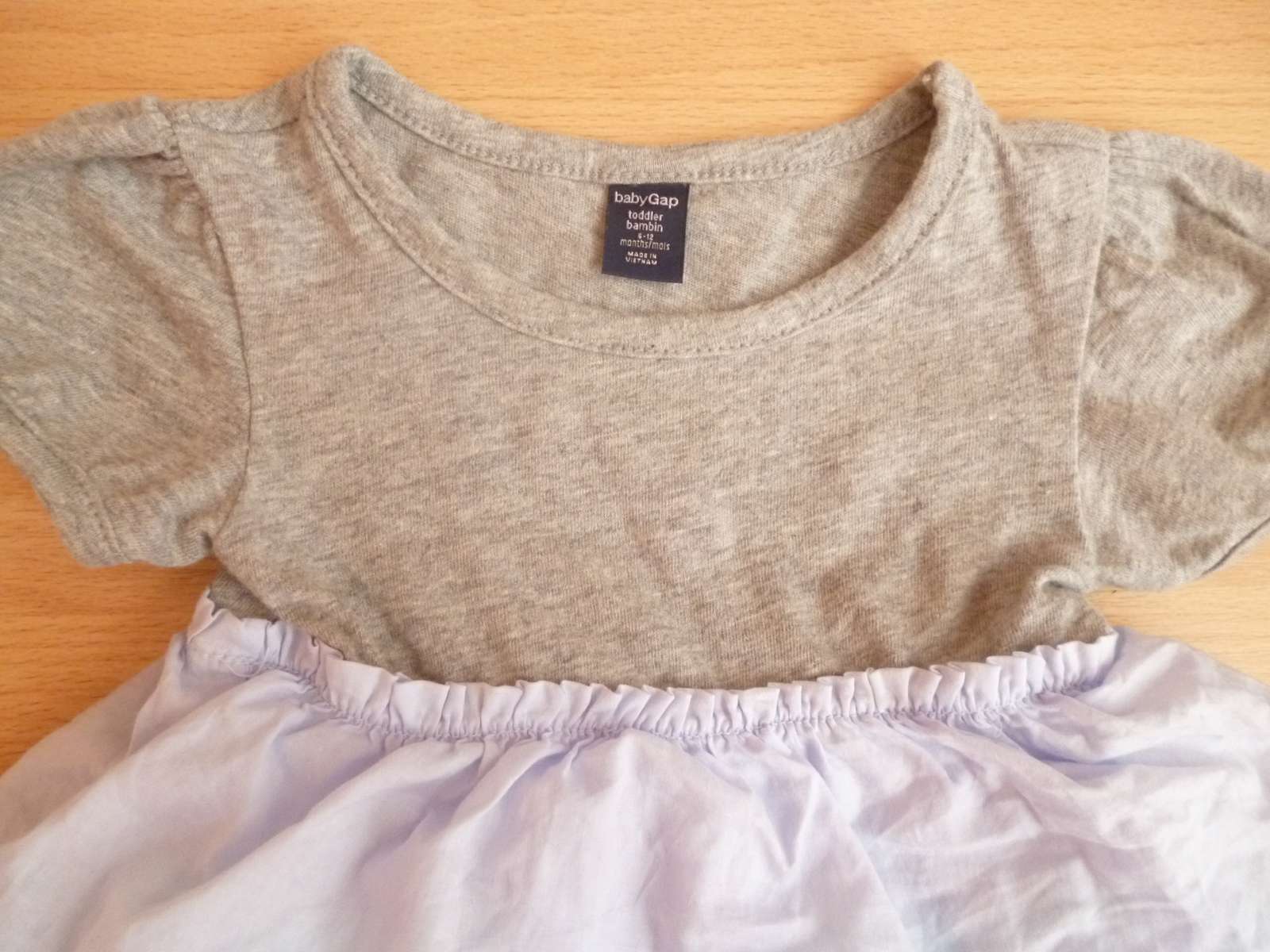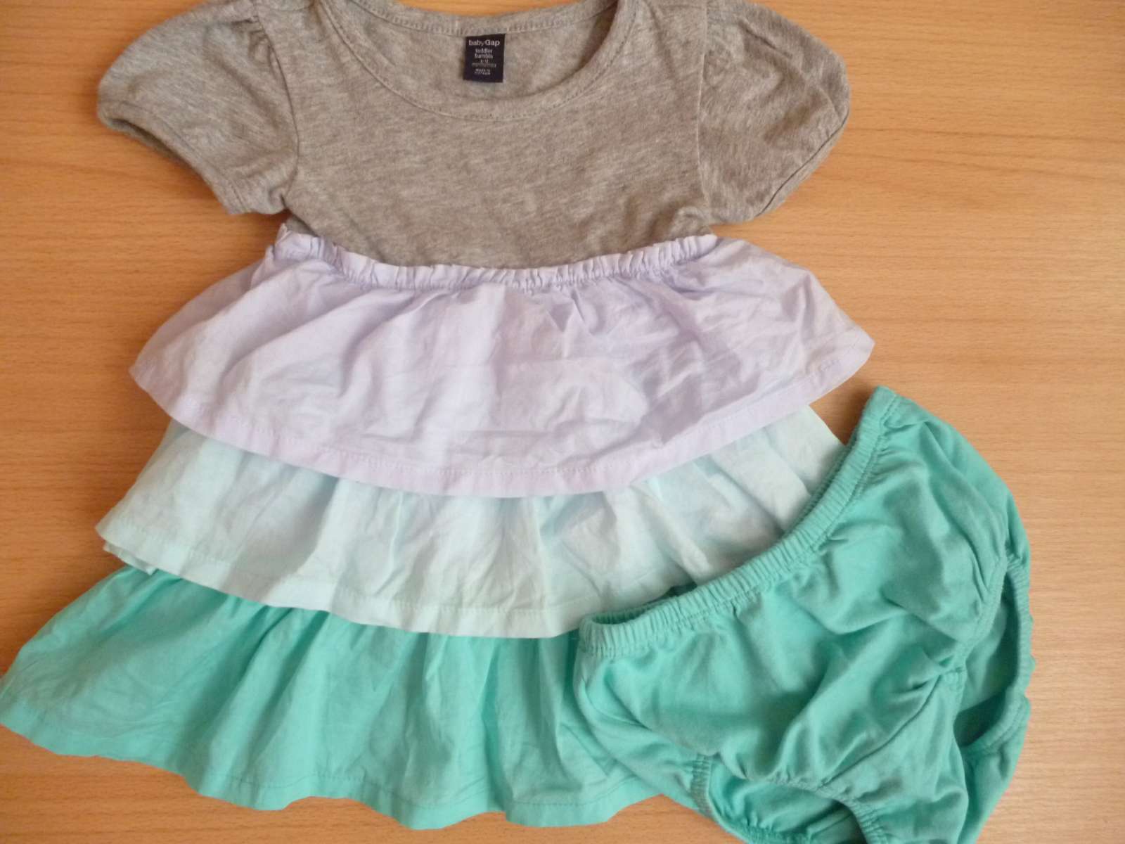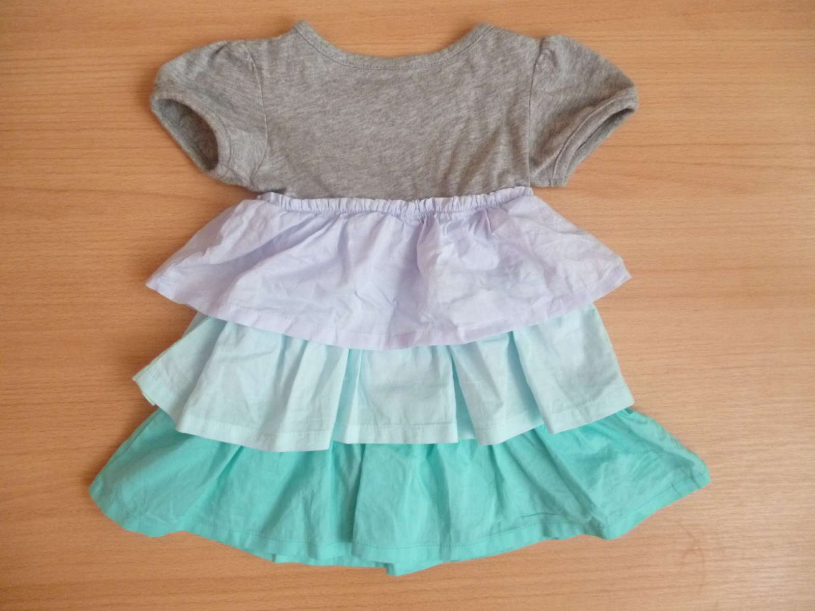 Stopercentný stav, oblečené iba dvakrát. Hornú polovicu tvorí tričko, dolná je klasicky šatová s volánmi, spolu to vytvára veľmi moderný "punkový" dojem. Nádherné, živé farby, príjemný materiál. Súčasťou sú nohavičky na plienku. Udávaná veľkosť 6 až 12 mesiacov.