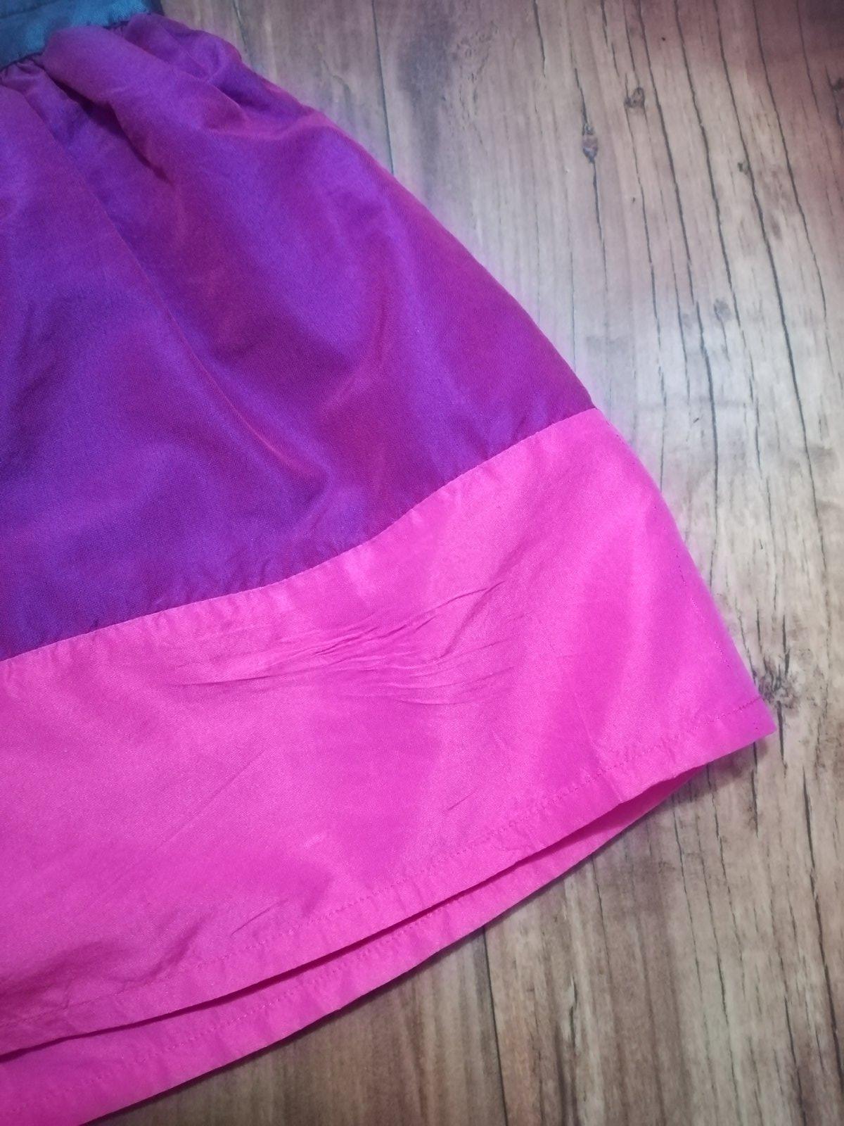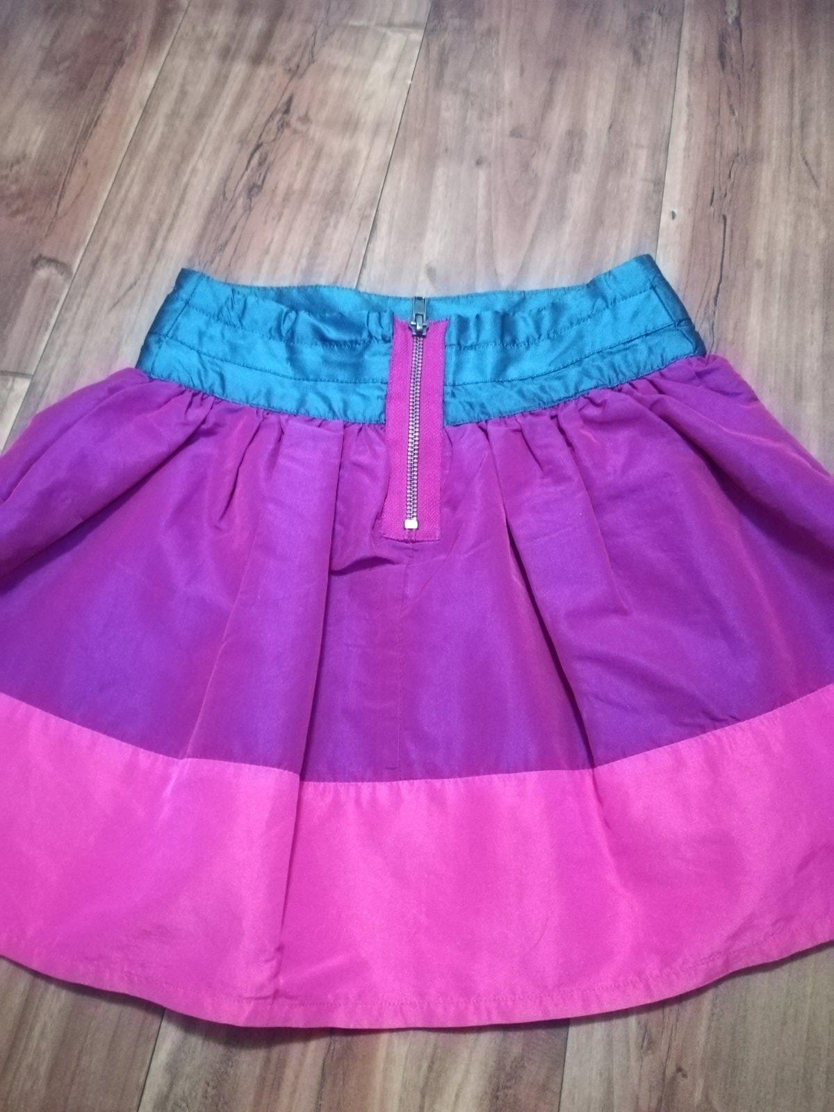Krásna taka metalická suknička, mali sme raz na svadbe, má spodniču, ta látka je akoby taky pevnejší šušťak, pekne drží tvar. Oblečená len raz, je v super stave len na tej ružovej časti mierne zosuverena látka, viď foto, na tej látke sa to stráca. Pás regulácia 28cm, dĺžka 34,5cm