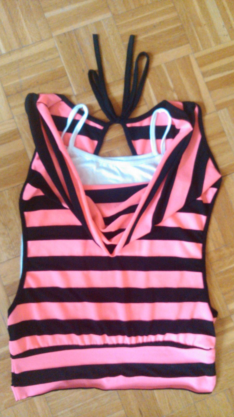 Krasna syta neonova farba,no na fotke je bohuzial osvetlene bleskom...Zaujimavy dvojity strih,biele tielko sa da zvnutra odstranit a mozete ho nosit aj bez neho.Oblecene vyzera naozaj super.Kuk vsetky moje inzeraty,mozna aj vymena za nieco od vas :-)