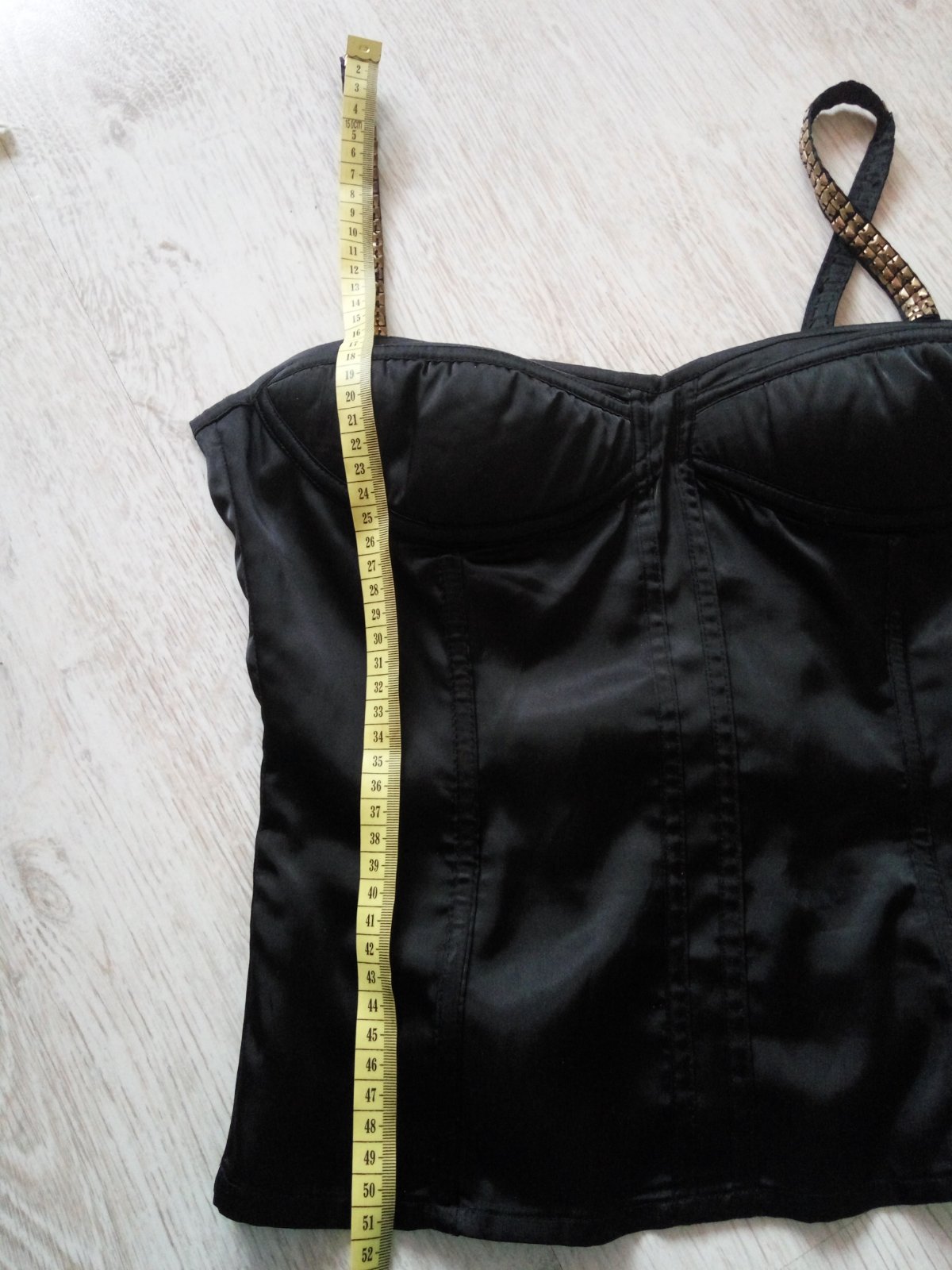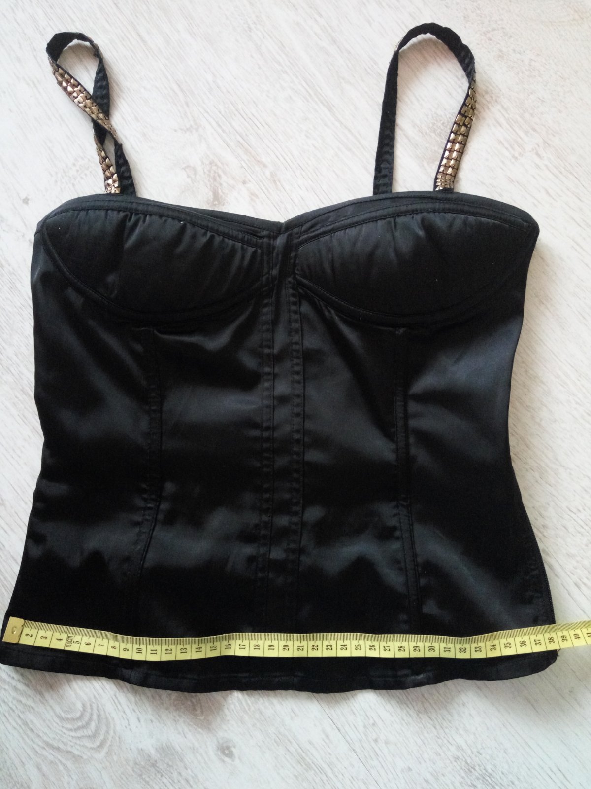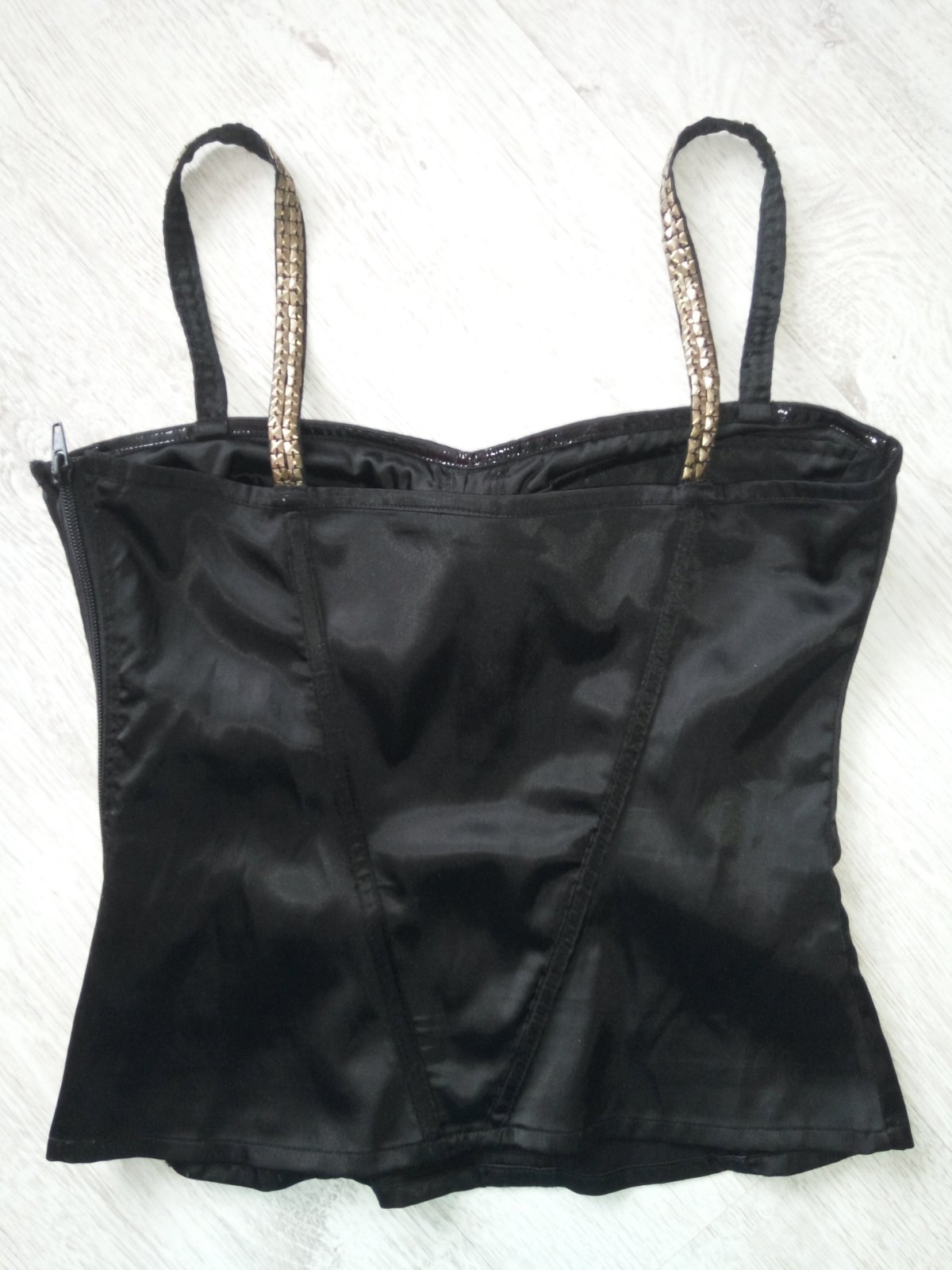 Nádherný sexi saténový top s vybijanymi ramienkami. Dá sa nosiť bez podprsenky, na prsiach je vystužený s protišmykovým pásom. Na boku som ho dala prešiť na zips lebo pôvodne sa veľmi ťažko obliekal. Je v top stave. Vhodné na obvod hrudníka 80cm. Ramienka sú kúsok zašité ale dajú sa popustiť.
