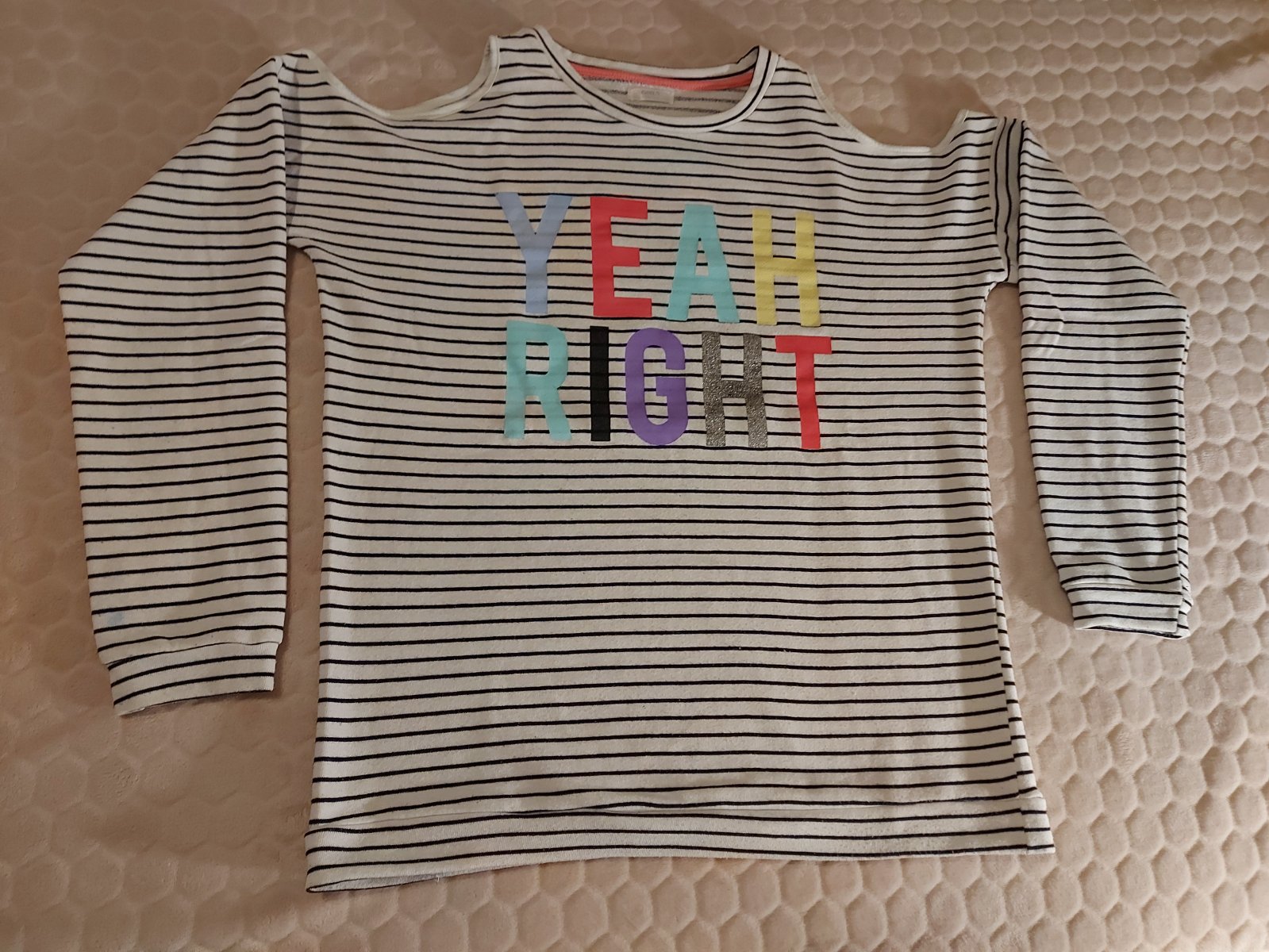 Pekný noseny stav-tričeno má na plecách výkroje...na rukávoch som našla fliačky asi od vodových farieb--možno zmiznú...dl.od pleca-63...š.pod pazuch-55 a v páse 48...dl.r.od pleca-68