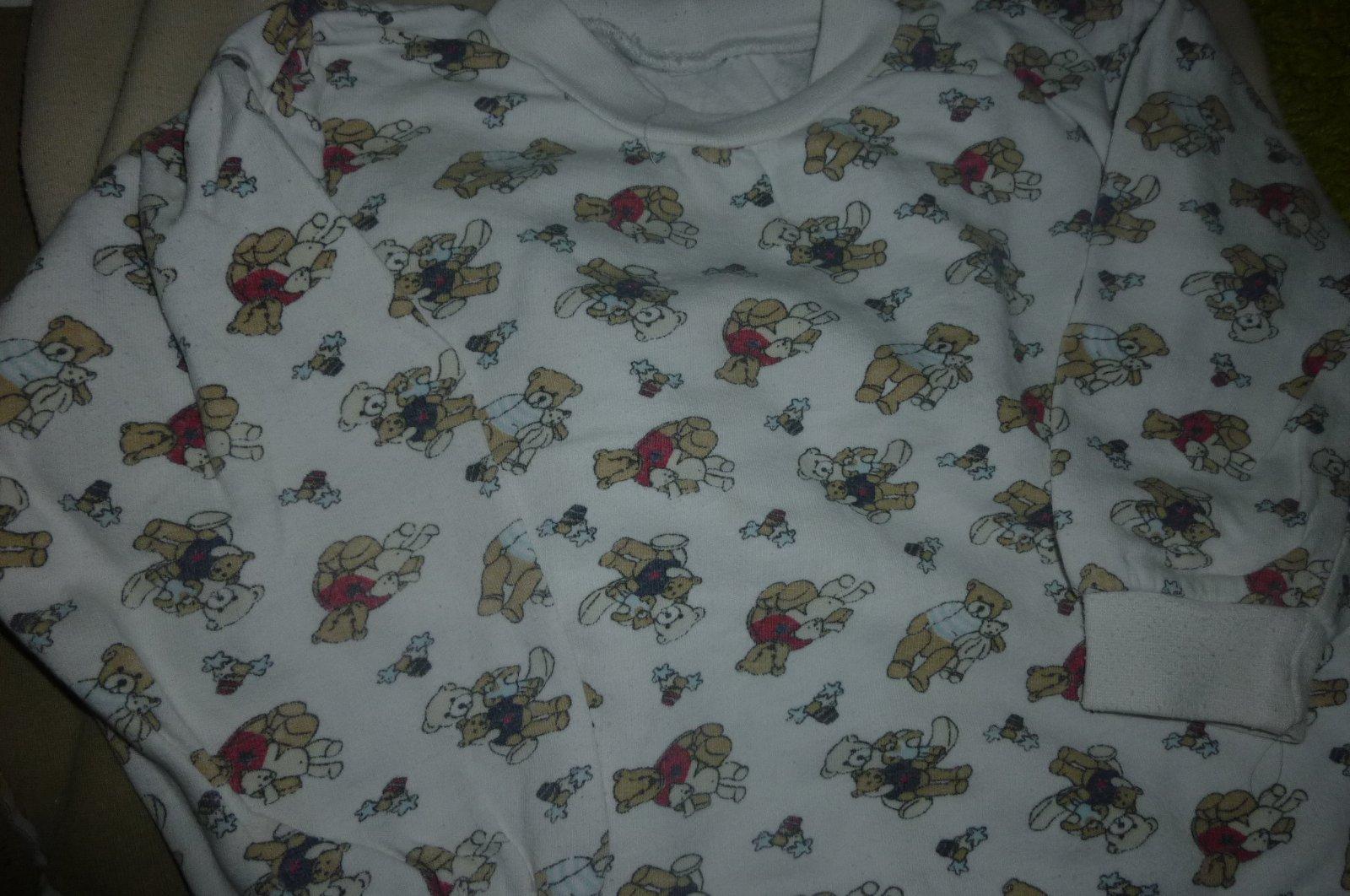 Biele s modrým lemom na krku a modrými medvedíkmi, šírka pod pazuchami 43, dlžka rukáva 27, celková dlžka 33,5