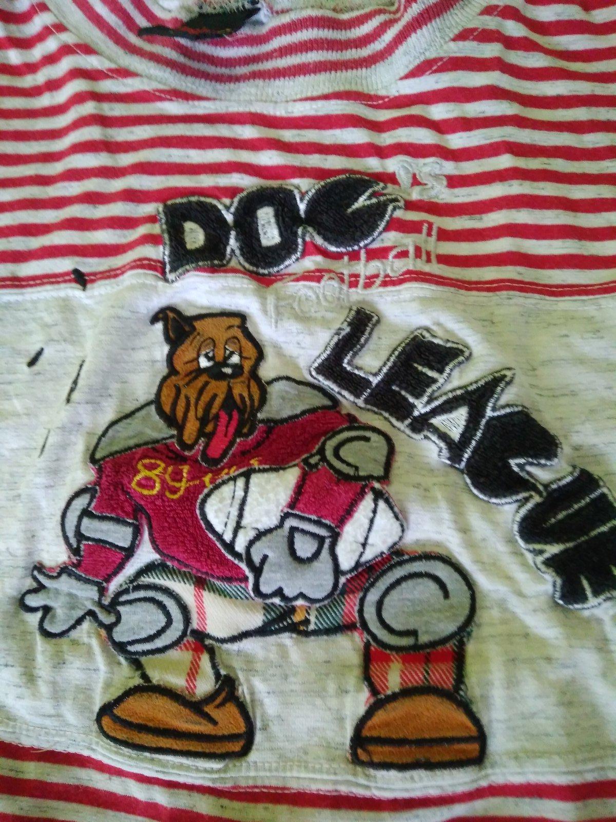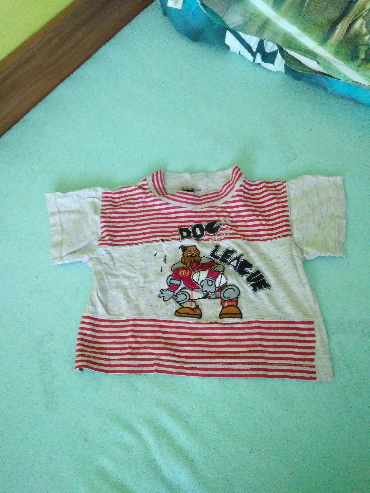 Posuniem pekné tričko, uvádzaná veľ. 98. Mne sa zdá kratšie. Nemá fľaky, len je širšie. My sme nosili aj tak . Kto chce ponosi. Len za poštovné.