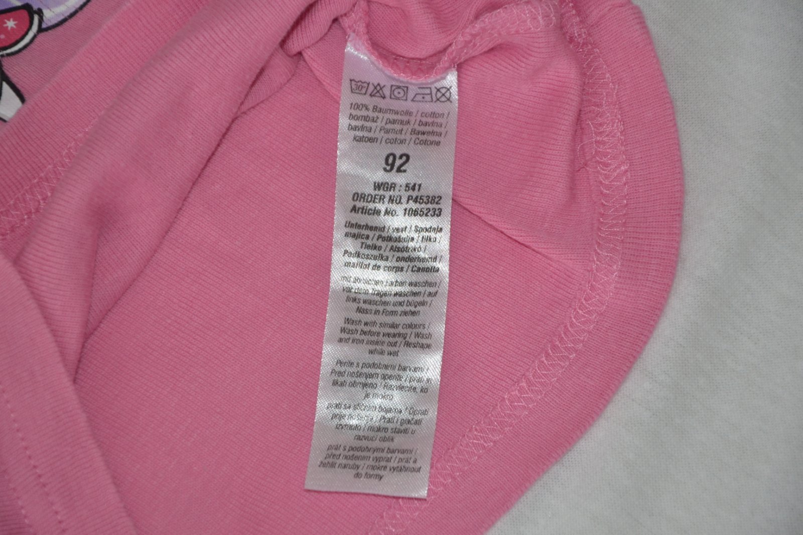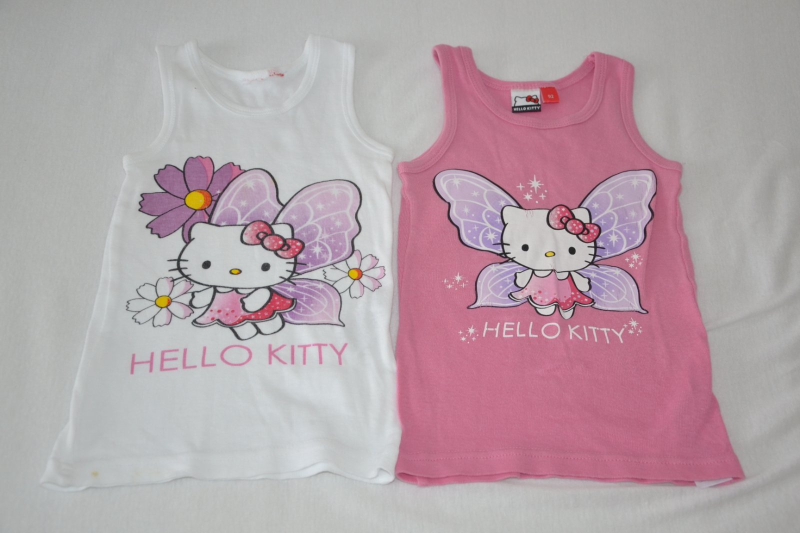 Nosené, jemné žmolky. Na bielom dolu je fľak. Na ružovom je nažehľovačka na dvoch niestach popukaná. Cena spolu, bez poštovného.