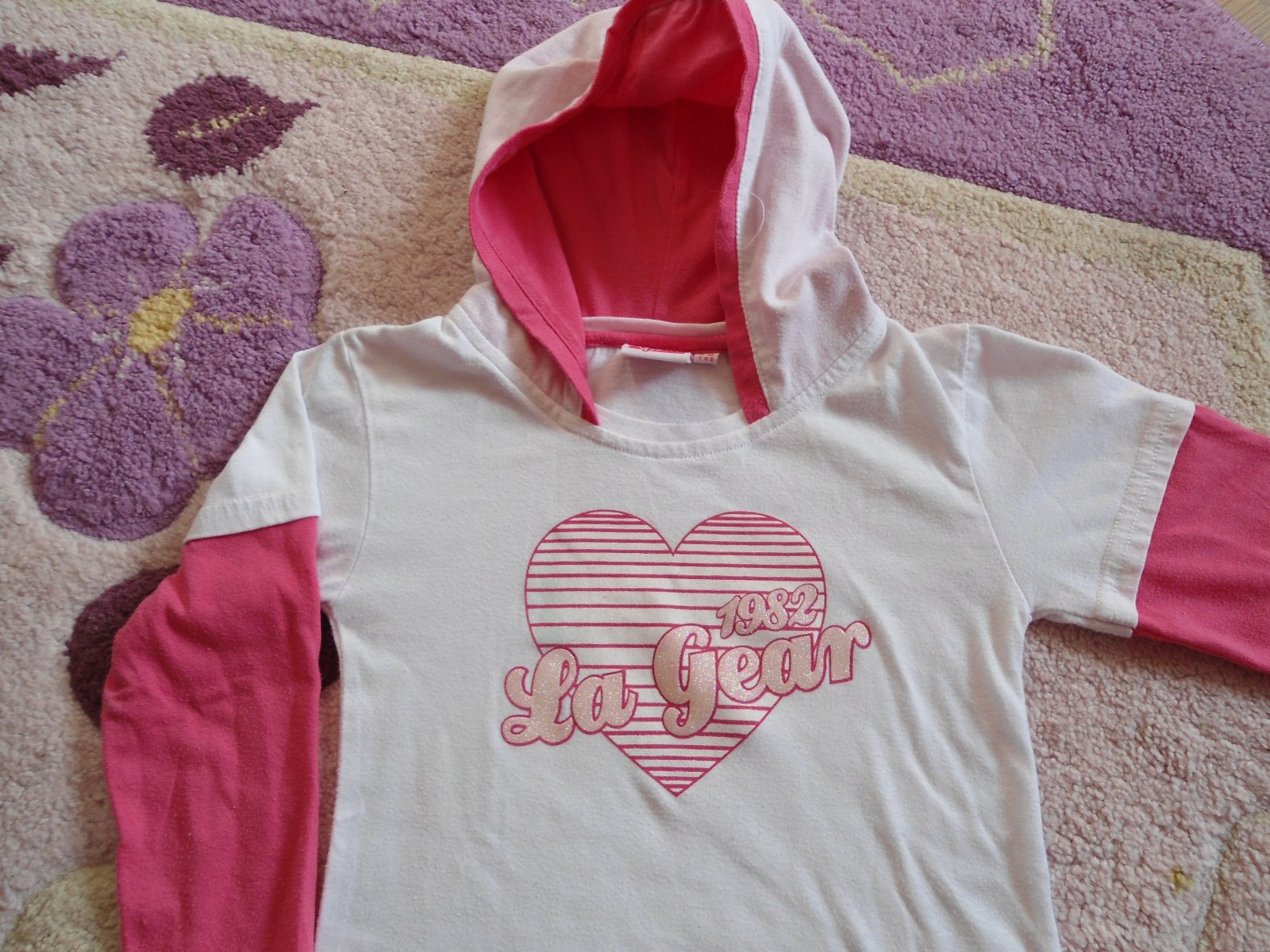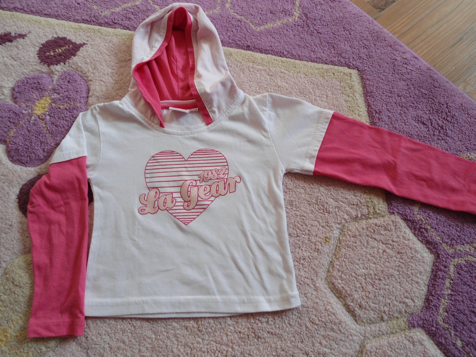 bielo ružové tričko s kapucňou, veľkosť je písaná 5-6 rokov, ale je skôr na 5 rokov