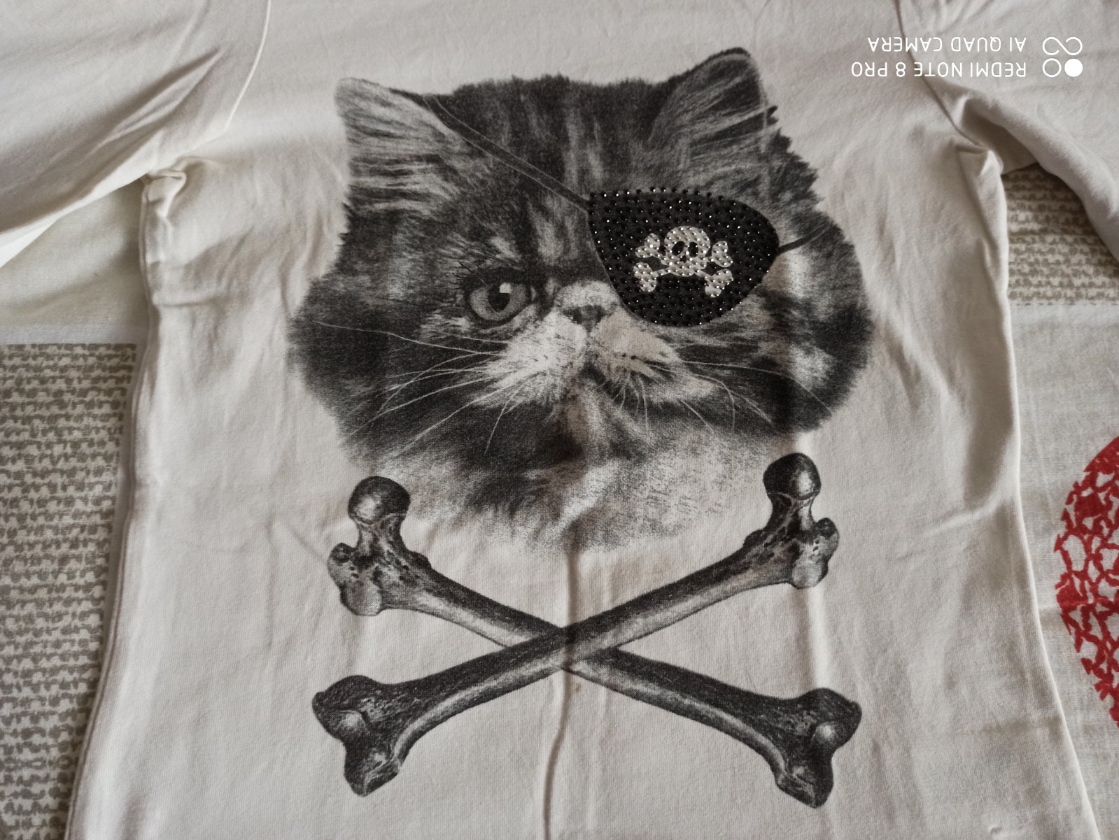 Kvalitné bavlnené tričko / tunika, mierne A-čkový strih, so sedlom a aplikáciou vo fialovo-ružovo-čiernom odtieni, písmenká sú jemne zdobené lesklými cvočkami. Nosená, vo výbornom stave, jedna malá...