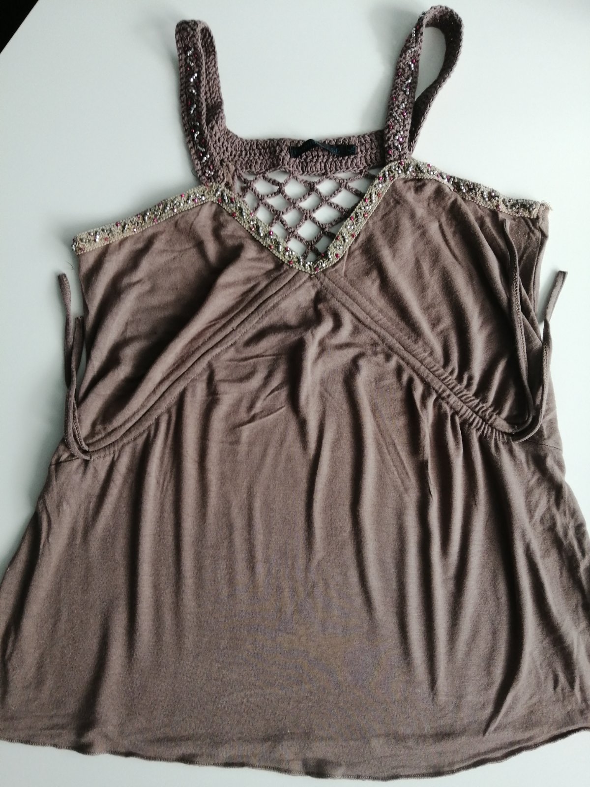 dámsky tmavo hnedý elastický top na ramienka, príjemný kvalitný materiál, zloženie: 92 % viscoza, 8 % elastan, stav: dobrý, málo nosený, značka: Marks & Spencer, uvádzaná veľkosť na štítku 18, zod...
