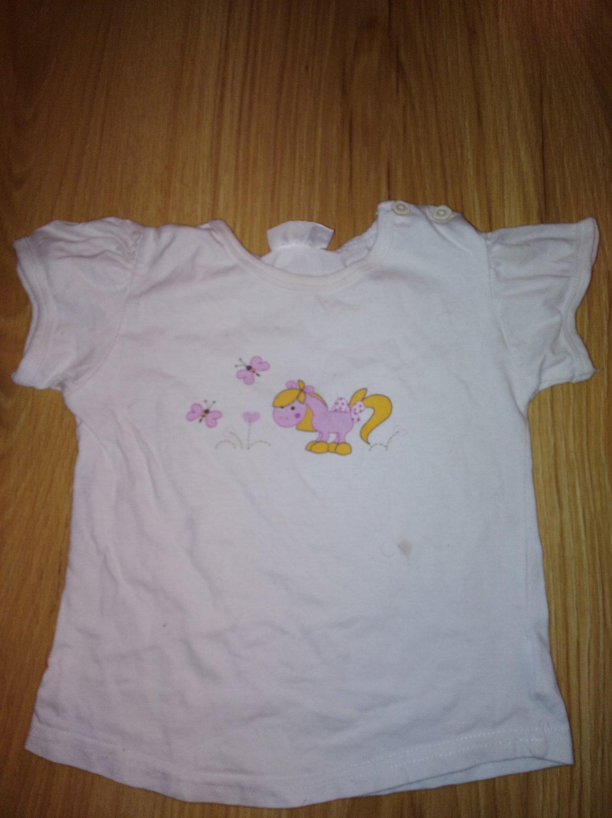 Predám biele tričko s koníkom a motýlikmi, veľkosť 86, celková dĺžka 34 cm