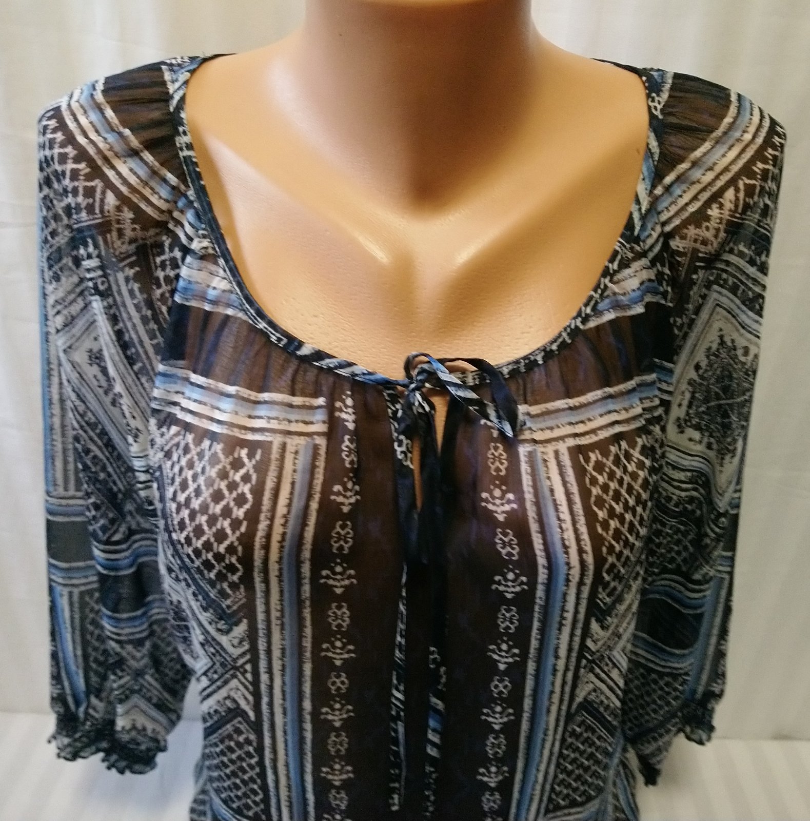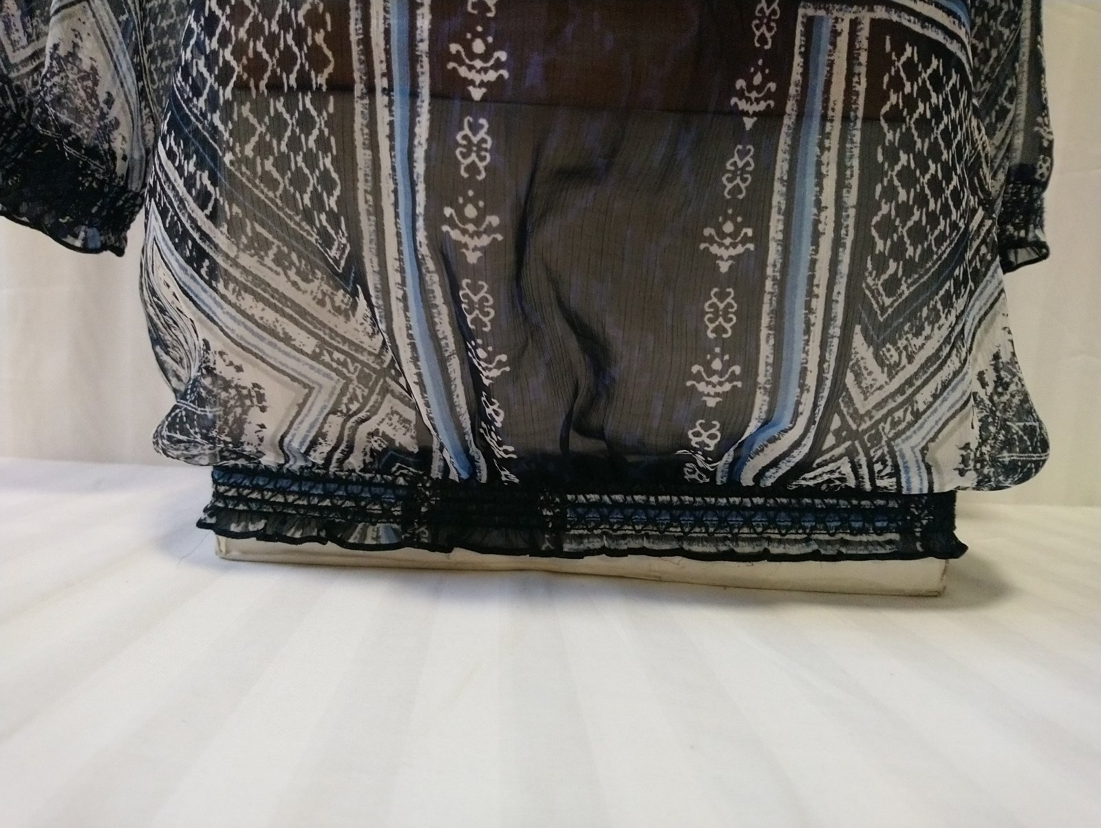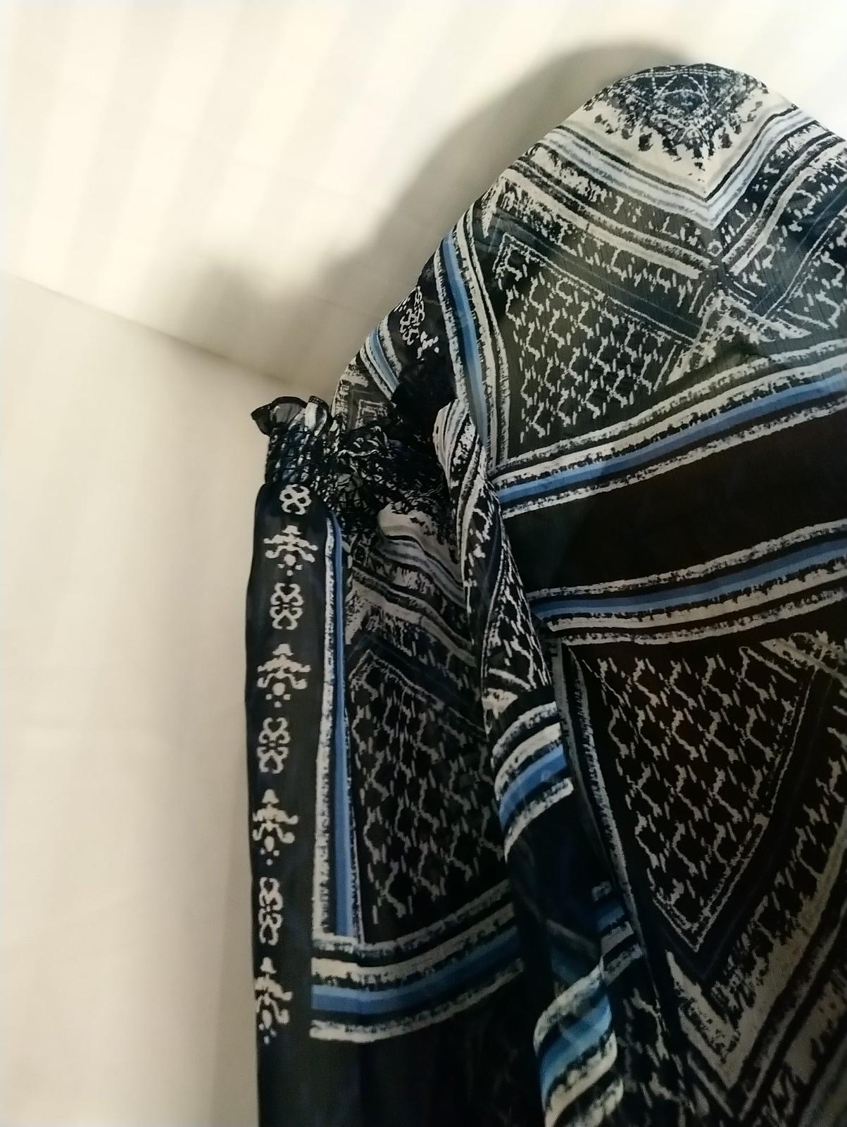 dámsky modro čierny top s farebným vzorom, presvitá, 3/4 rukáv, dole zakončený do gumičiek,