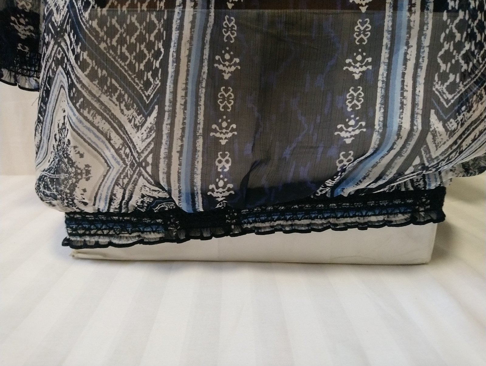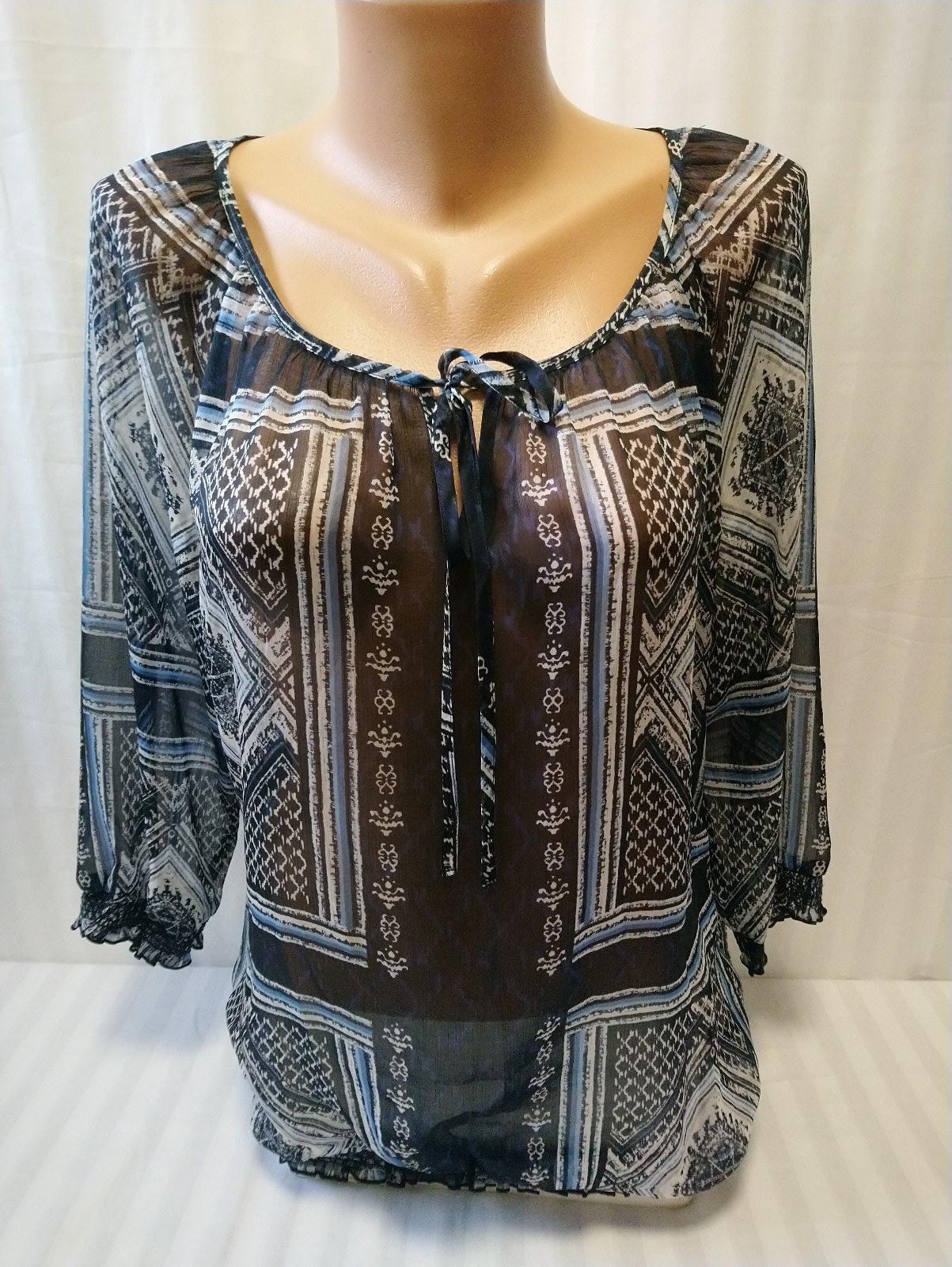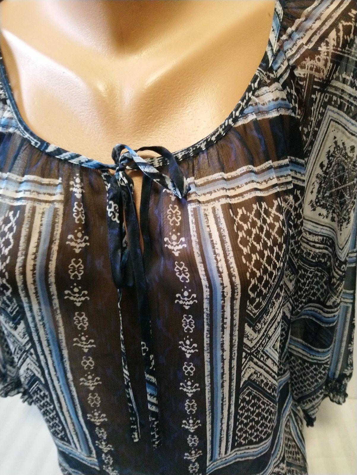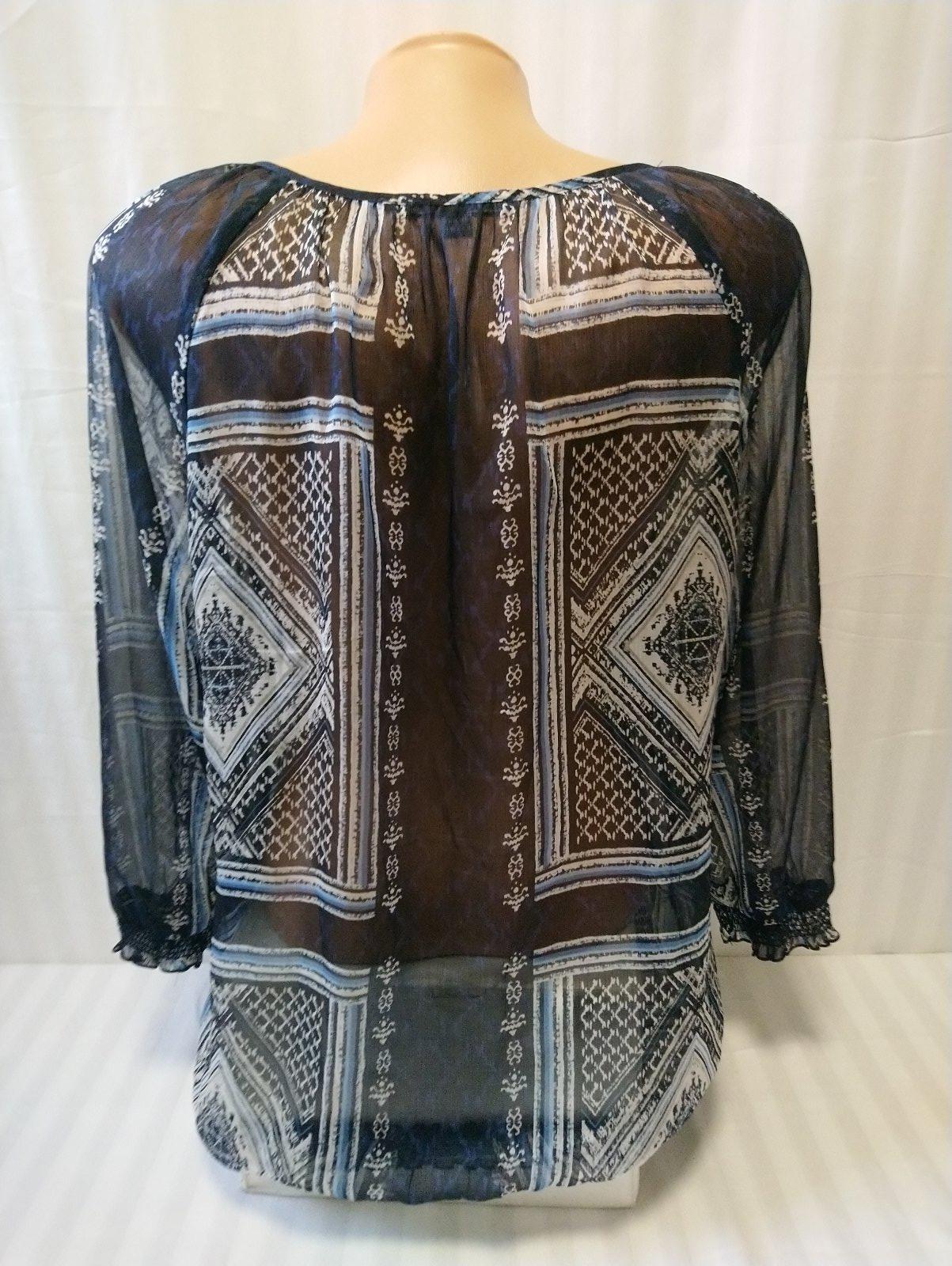 dámsky modro čierny top s farebným vzorom, presvitá, 3/4 rukáv, dole zakončený do gumičiek,