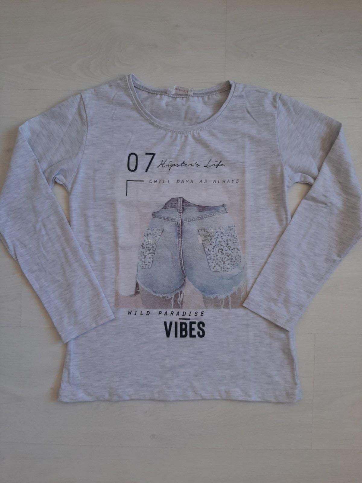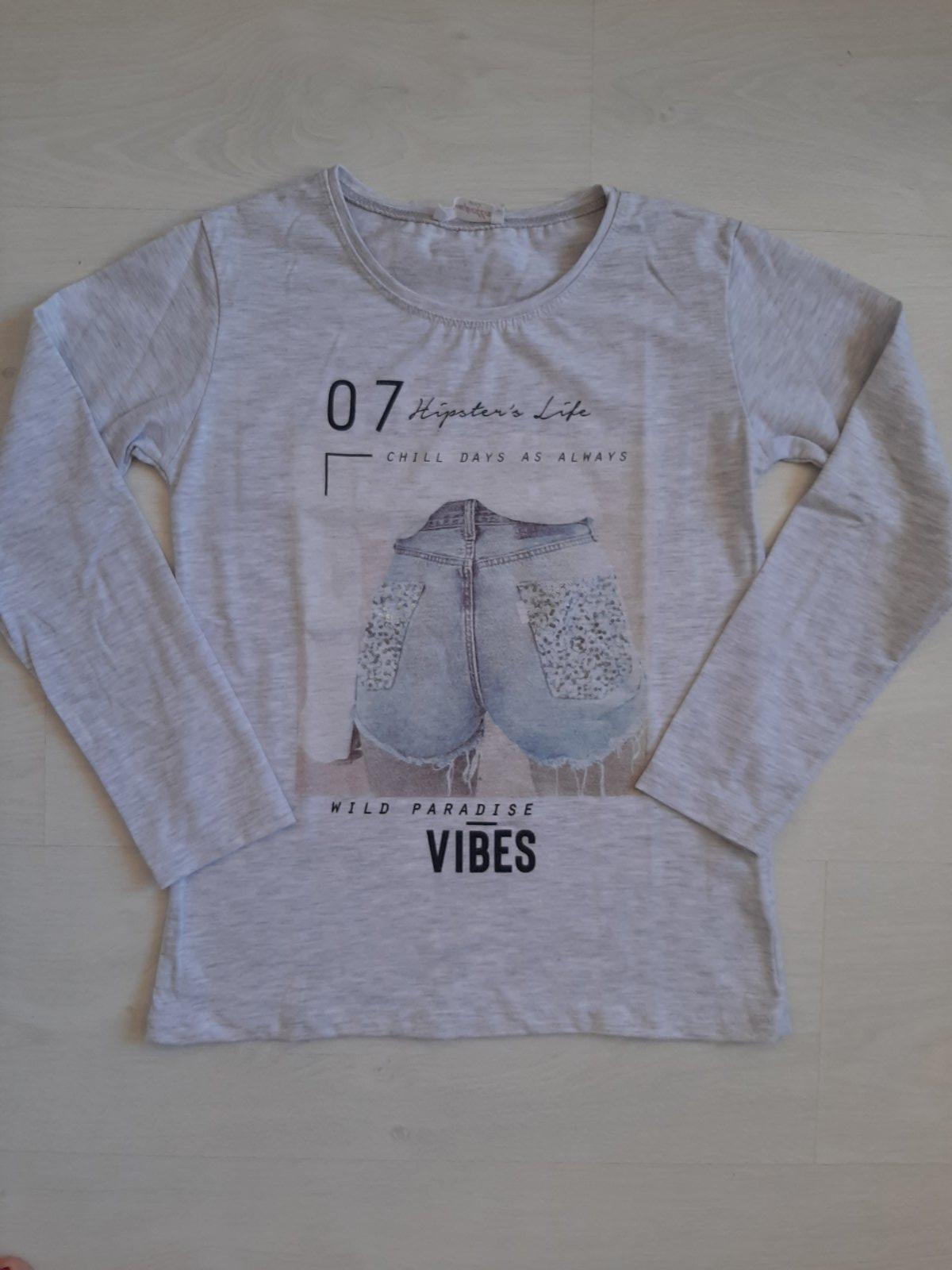 dievčenský sivý top s nápisom, vzadu roztvorený, príjemný kvalitný materiál, zloženie: 67 % polyester, 33 % viscoza, stav: dobrý, málo nosený, značka: H&M, uvádzaná veľkosť na štítku 9-10 rokov, 13...