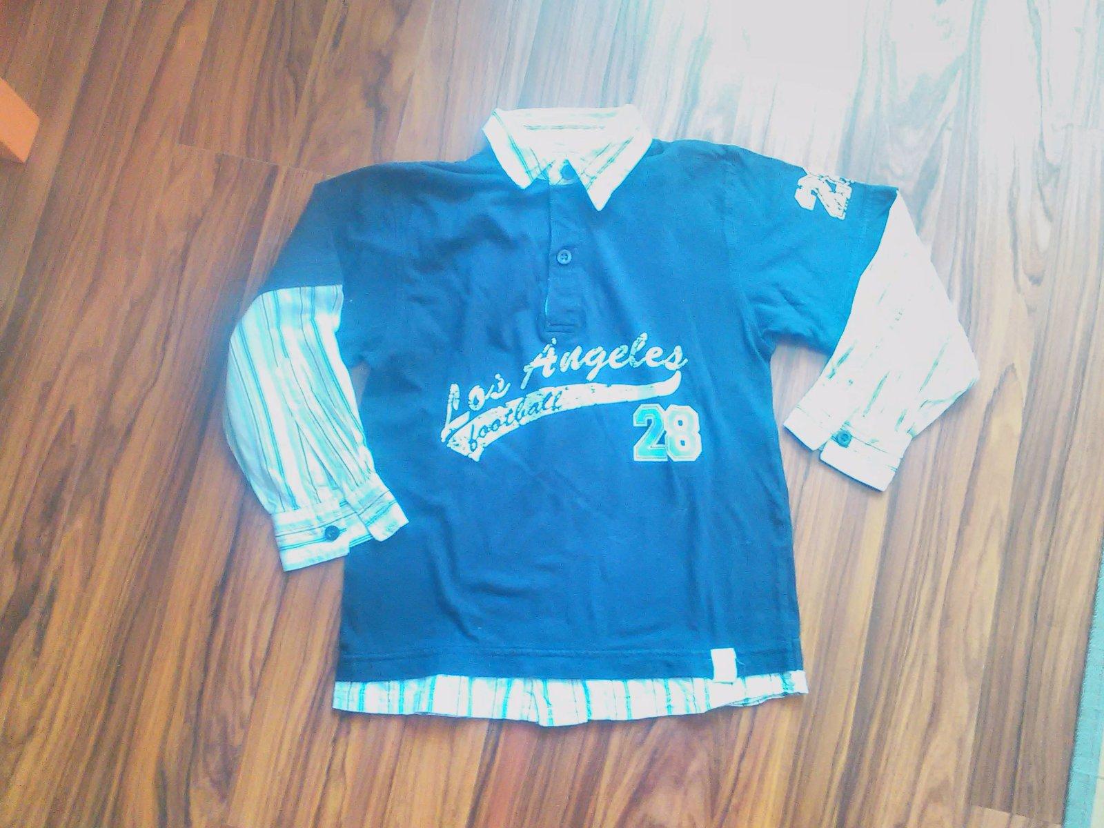 Tričko s košeľovými rukávmi a golierom. 122-128, D-46cm, š-37cm, r-38,5cm. Vpredu dolu sú nejaké nevýrazné fliačiky.