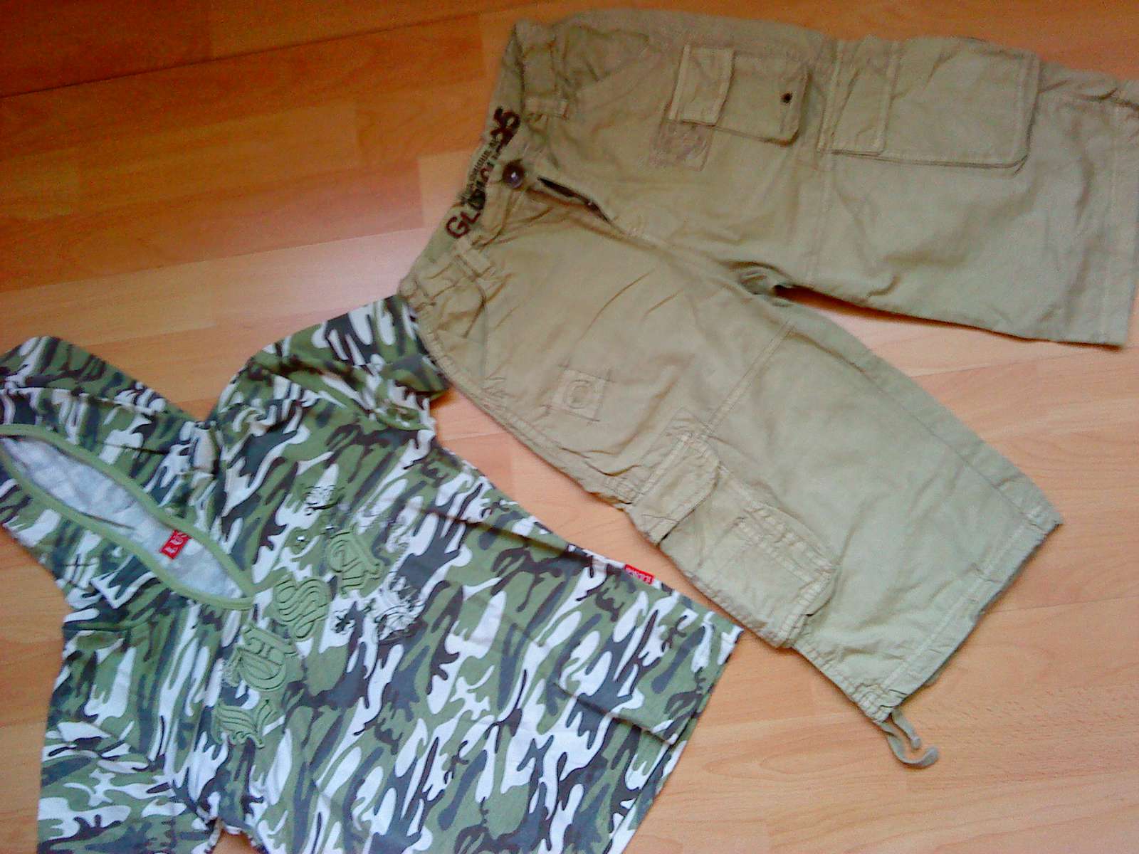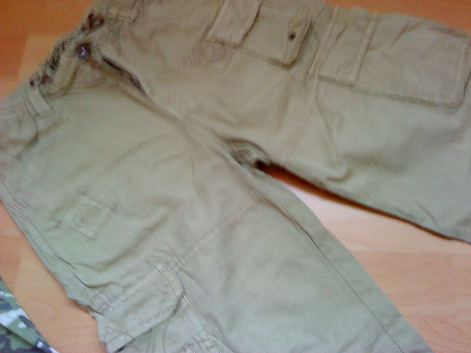 Maskáčovo zelené veľ 146/152, dlz.52cm, šír. 41cm,cena 3€. Kraťasy veľ.140, pás s gumičkou 30cm natiahne sa na 36cm , dlžka 56cm, cena 3,80€..Mám toho viac, treba pozreť v albume, dcéra vyraďovala z čoho vyrástla.