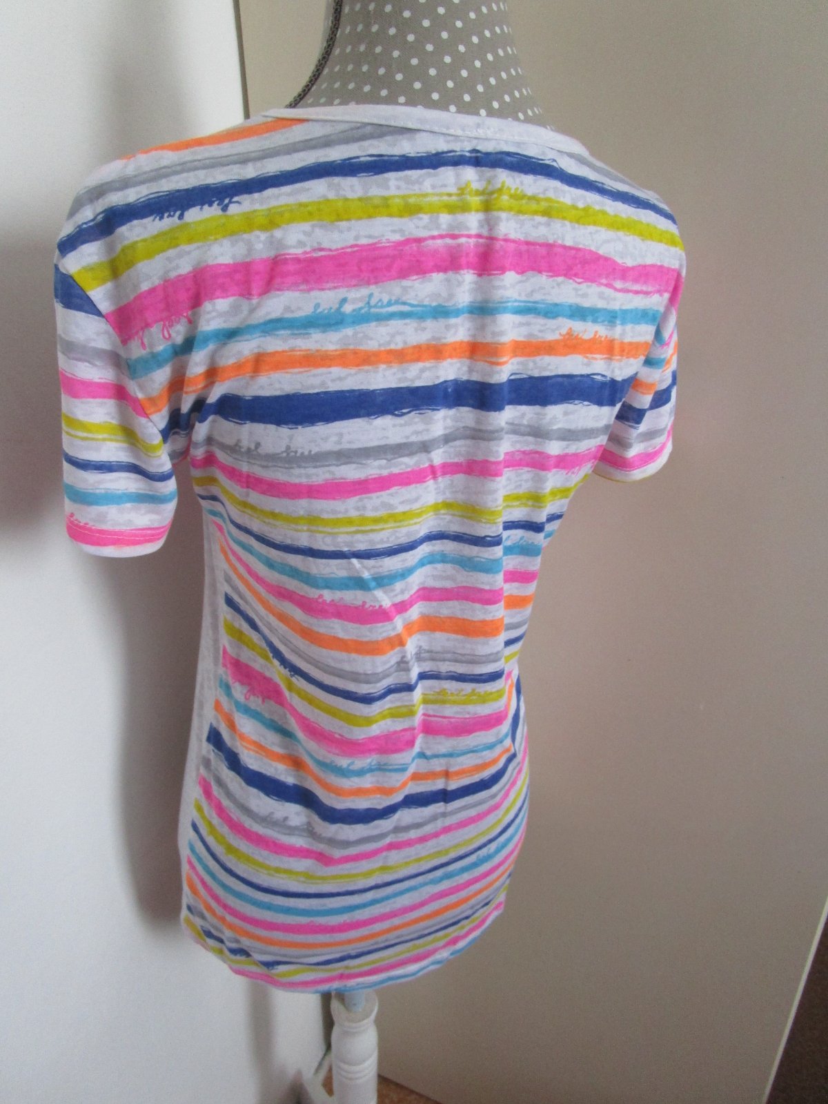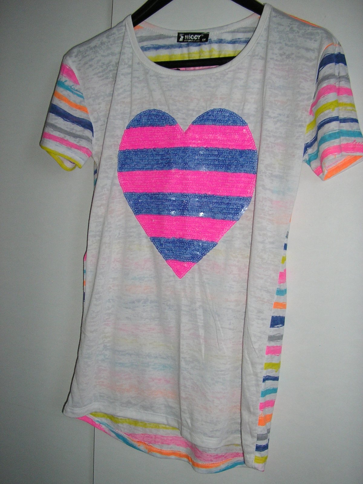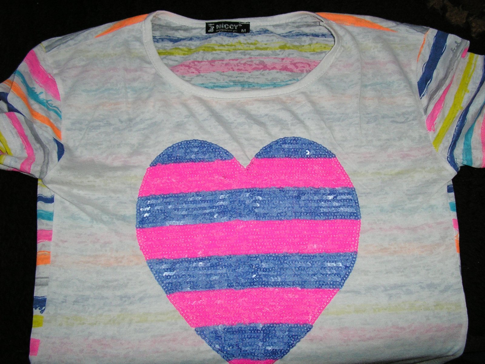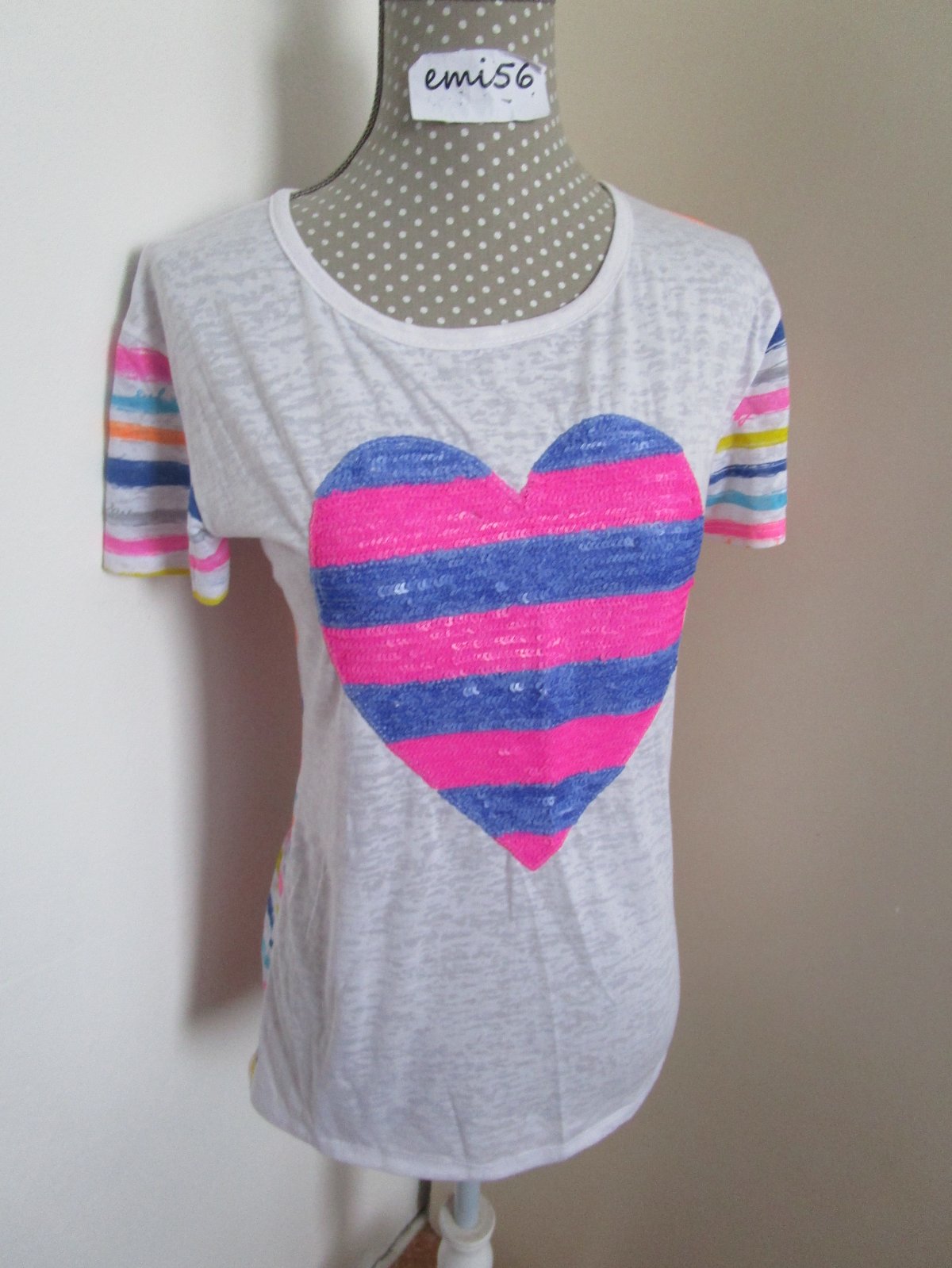 Veľmi atraktívny a zvodný strih. Rukávy krátke. Veľké srdiečko na prednej strane je zdobené flitrami. Zadná časť je prúžkovaná. Rovný dolný okraj. Uvádzam veľkosť, akú udáva výrobca. Vhodné na každú príležitosť. Pravý pútač pohľadov, ideálne na kombinovanie a skrášlenie oblečenia na párty. Bez fľaku a poškodení.