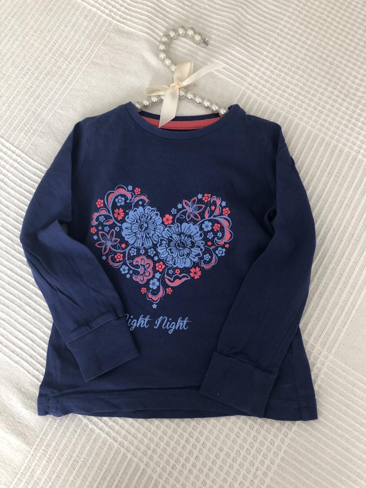 Predám tričko s dlhým rukávom tmavomodrej farby a s potlačou kvietka, rukávy sú biele a vyzerá to tak, akokeby bolo pod tričkom ďalšie tričko bielej farby s dlhým rukávom, v oblasti krku je malá tm...