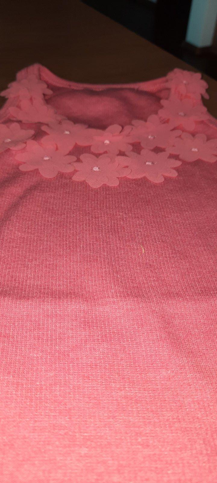 Slávnostné tričko s aplikáciou s kvietkom, nosené asi 1-2x, bez poškodení, volánikovitý motív na ramenách, rozmery odfotené. Síce 122, ale kľudne aj dlhšie, a aj skôr.
