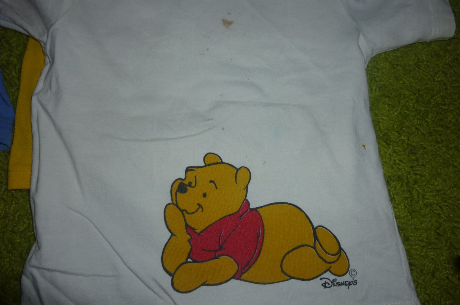 Krémové tričko s macíkom Pooh šírka pod pazuchami 31, celková dlžka 37,5, toto tričko má bohužiaľ aj fľaky, vidieť ich aj na foto, nešlo mi to dole, asi od jablčka, cena 1,5€