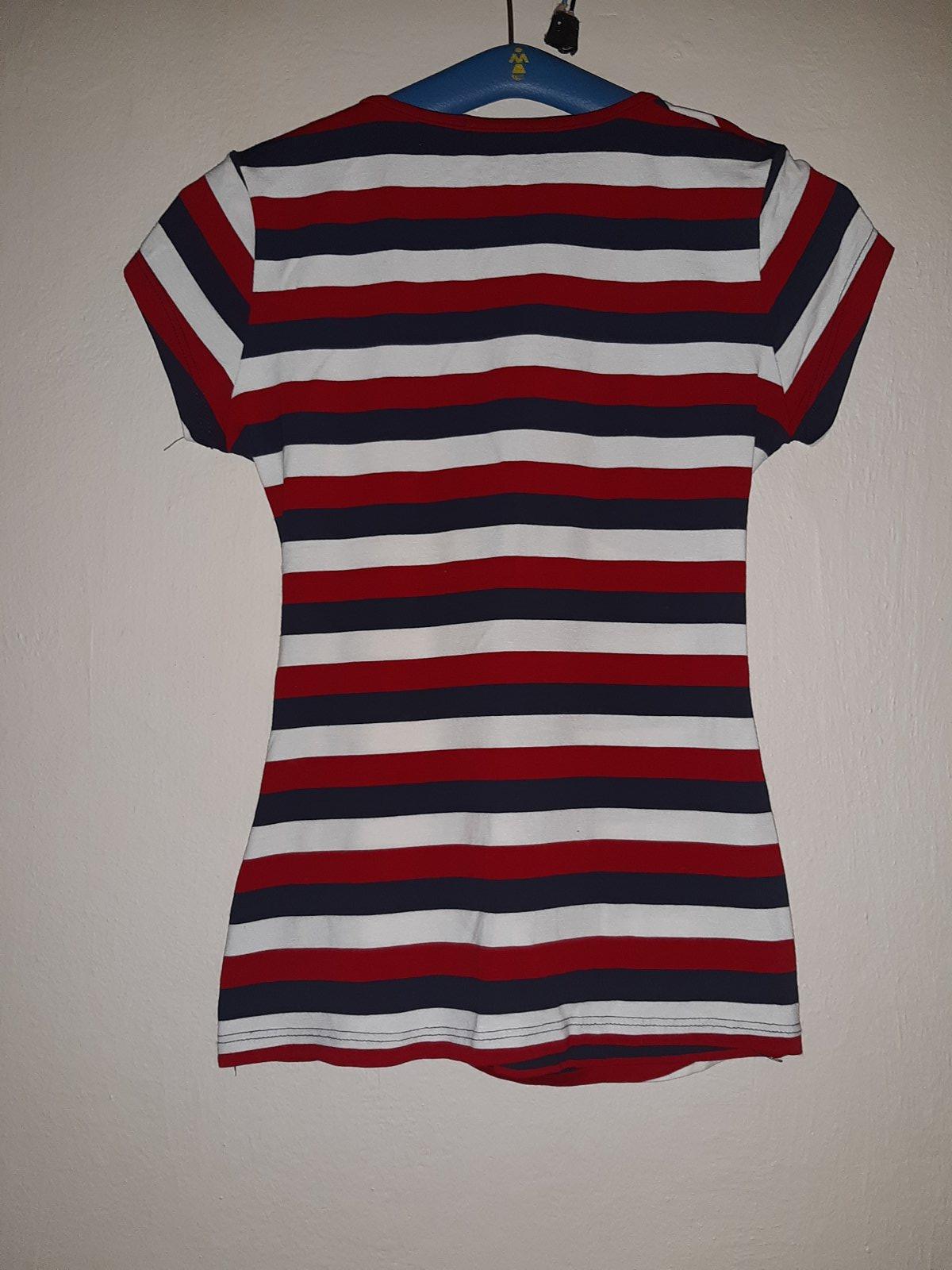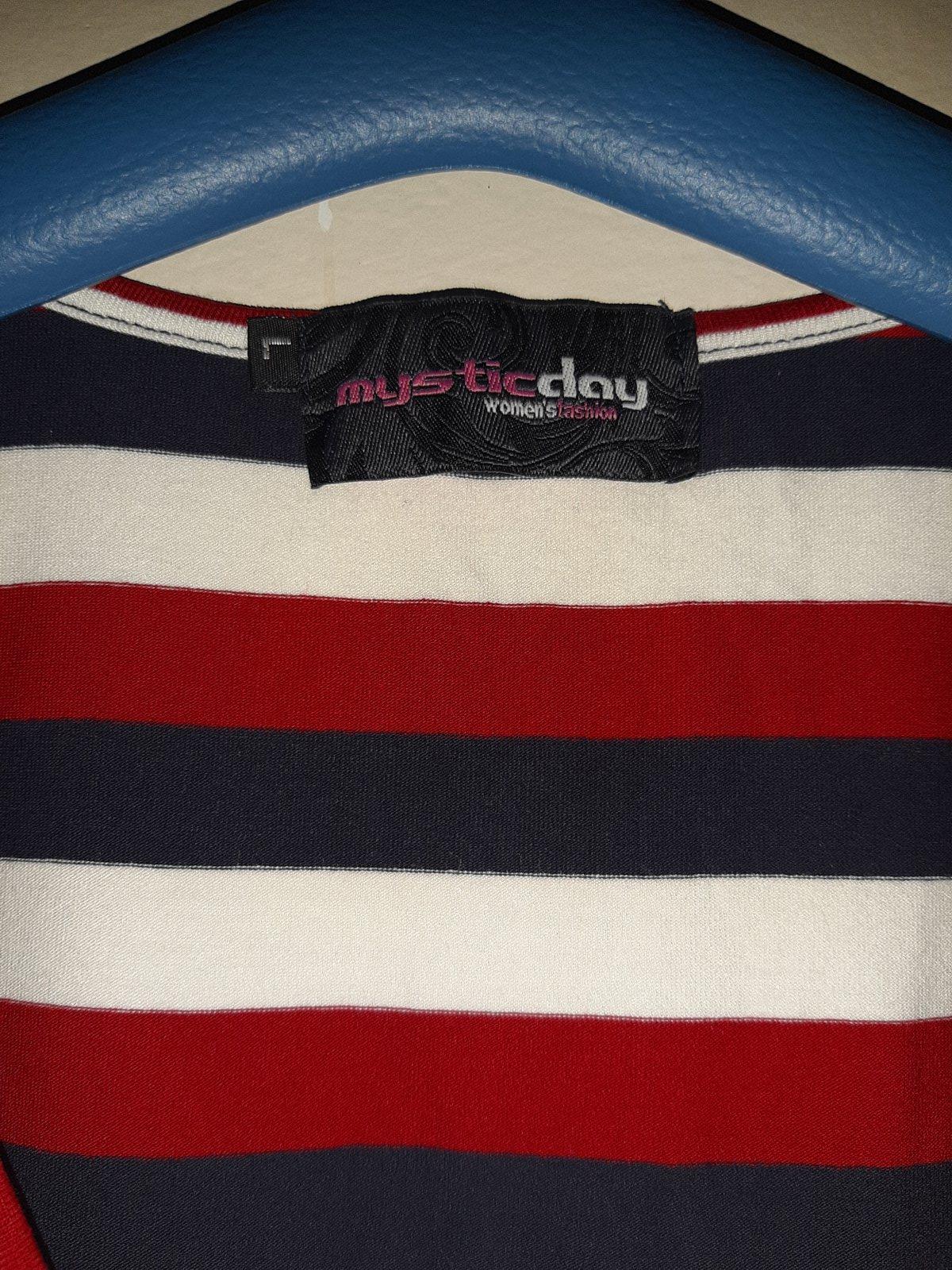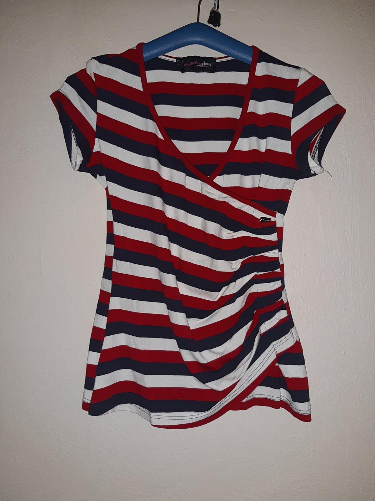 Dámske pásikavé tričko značky MYSTIC DAY s hlbším výstrihom, v top stave, elastické. Na etikete je veľkosť L, ale mierami vyhovuje veľkosti S.