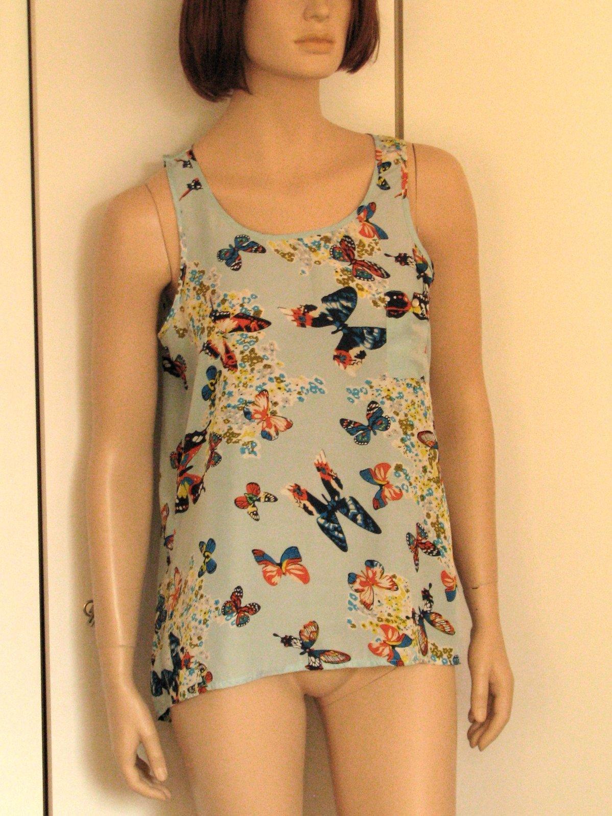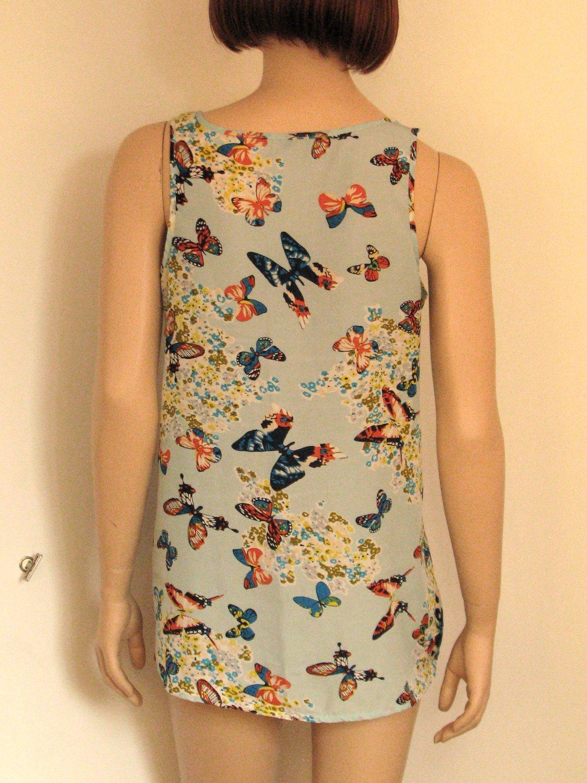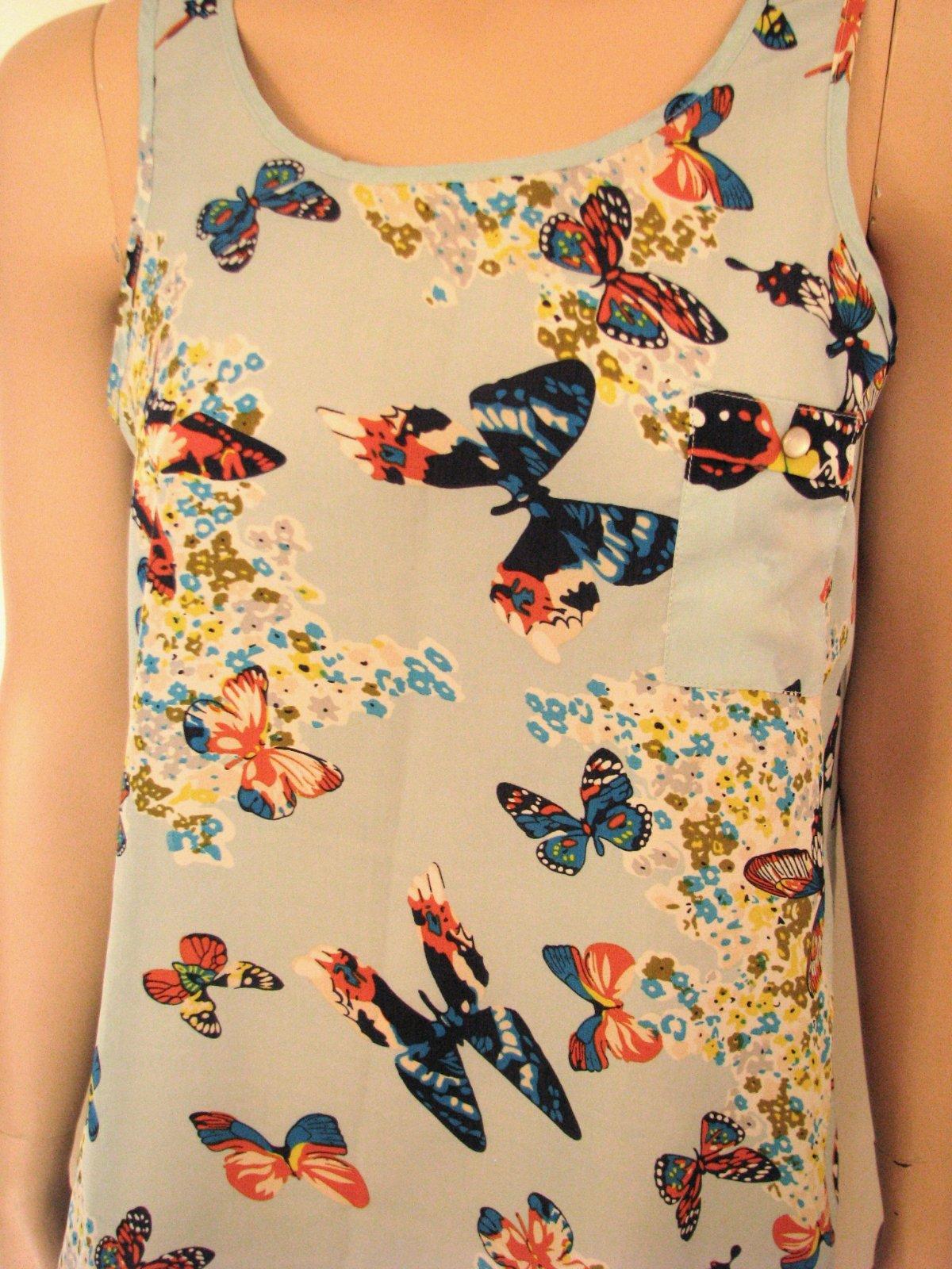 Bledomodrý topík so vzorom farebných motýľov na leto. Veľkosť uvedená 10, čo zodpovedá asi 38. Výborne zachovalý, bez poškodení. Rozmery sú: