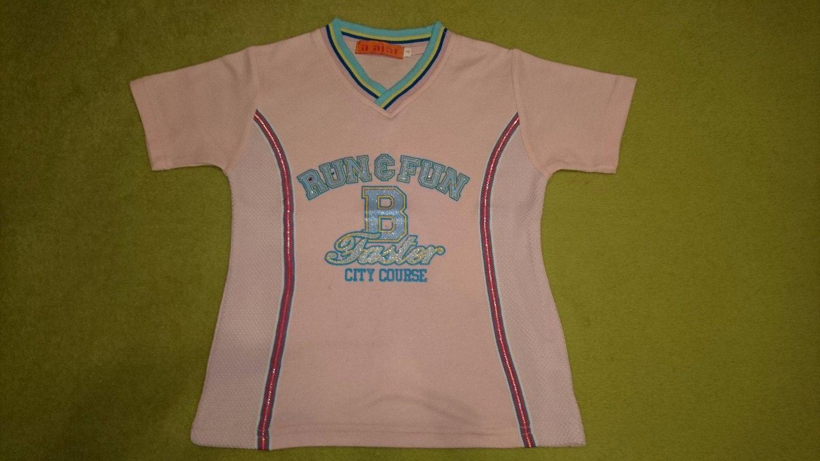 Športové tričko s krátkym rukávom, ružovej farby, zdobené na bokoch mriežkovým úpletom, oddelené viacfarebným prúžkom. Výstrih tvaru V je olemovaný 3-farebným lemom. Potlač na PD bledomodrej farby s trblietkavým nápisom. Strih mierne vypasovaný.