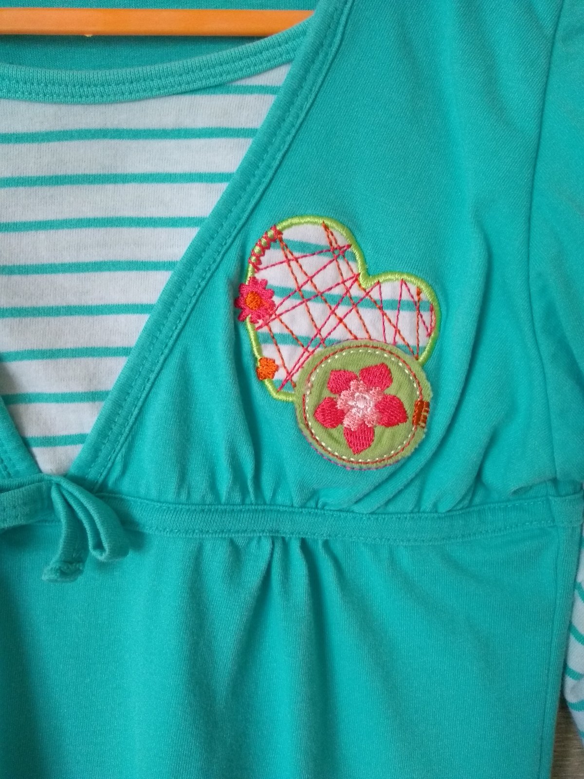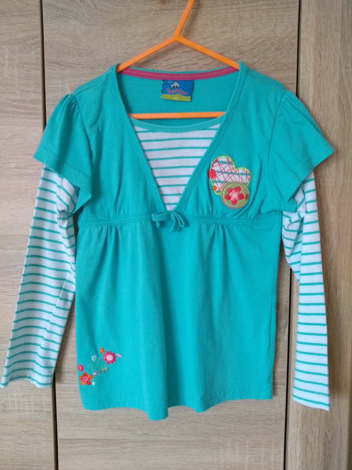Prekrááásne tričko s trblietavým motýlom a s čipkou, tyrkysovo-zelená farba, velkost uvedená 128, vhodné pre dievčatko na 6-7 rôčkov. Dávam do 122. Oblečené 1x, ako nové, 100% stav. Rozmery: dlžka ...