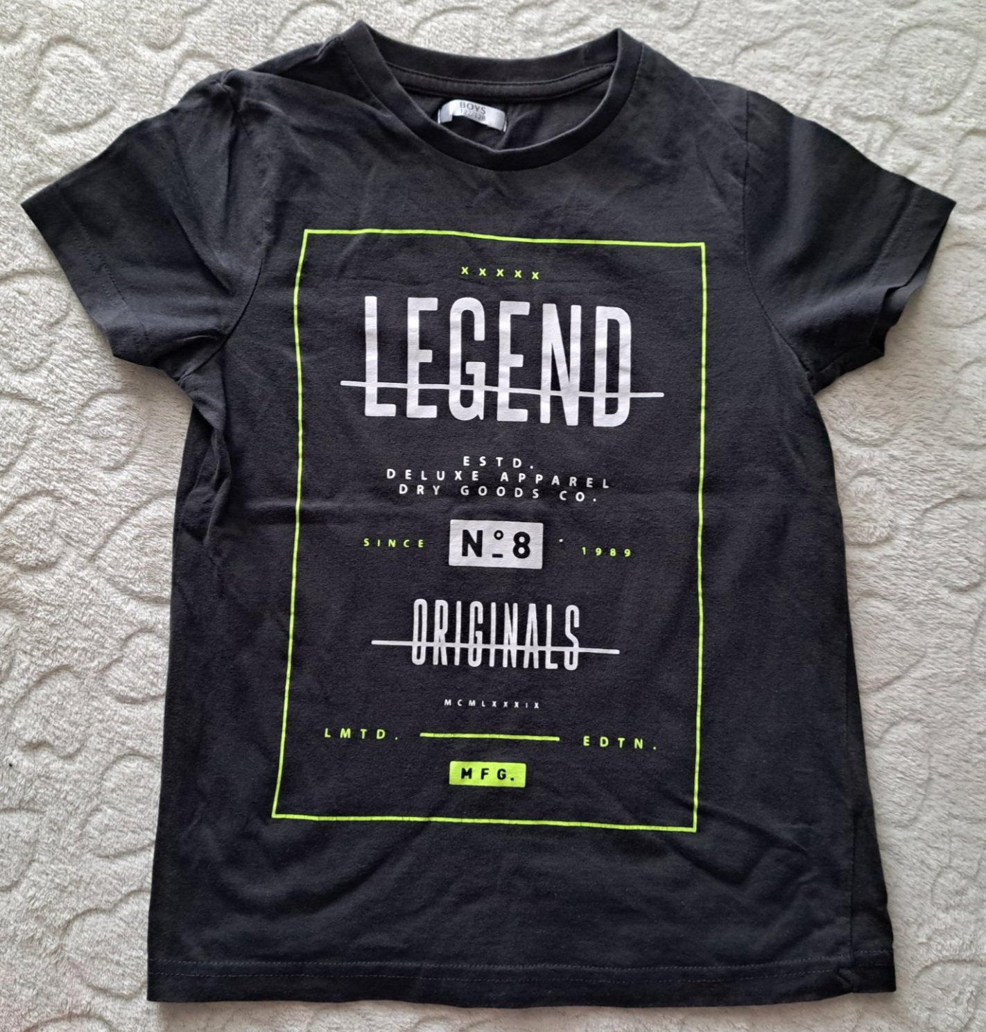 Predám tričko s KR, veľkosť 122/128, farba olivovo-tmavošedá, potlač bielo-neónovožltá, v peknom zachovalom stave.