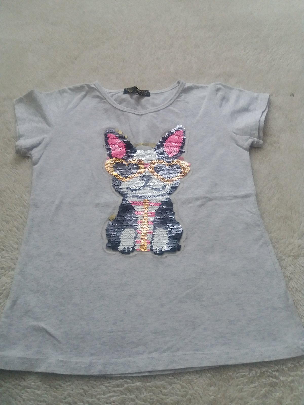 v super stave s meniacim flitrovim psikom,ve.uvedena 10 rokov,my sme nosili od 8 rokov,dlzka chrbta 47cm,sirka pod pazuchou 37cm,material bavlna