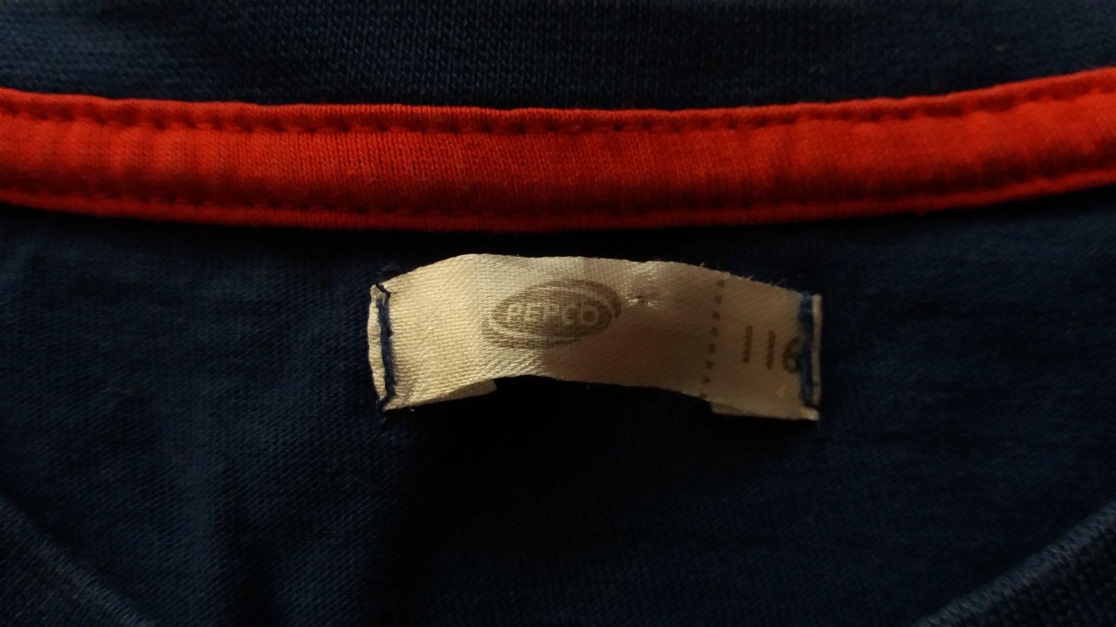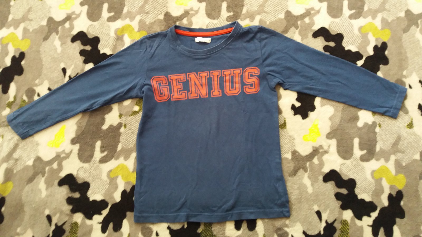 Pekné zachovalé tričko s nápisom GENIUS.Farba tmavšia ako na fotke.Dĺ.44cm, š.33cm, rukáv 36cm +7cm plece s golierom.
