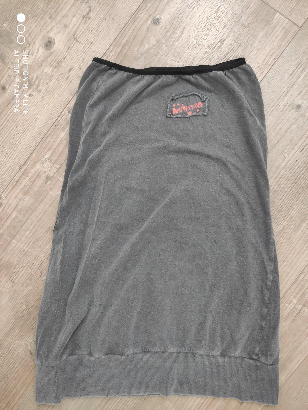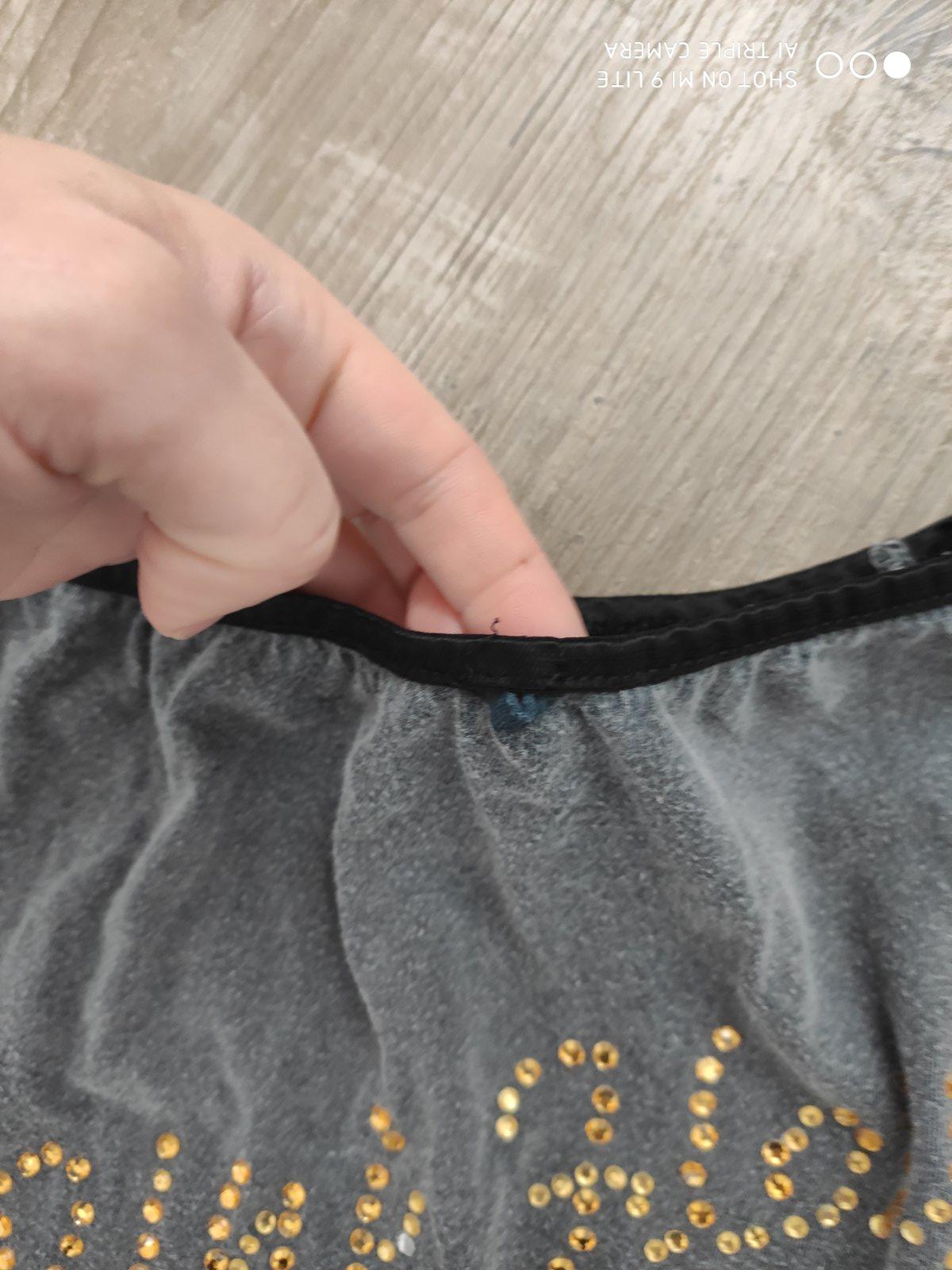nosene tricko bez rukavov v tmavo sivej farbe s kamienkami . top bol noseny , jeden kamienok je odpadnuty a top ma 2 malicke dierky ktore vsak nebude problem zvutra zasit a nebude nic vidno. urcite este niekomu dobre posluzi, je velmi stylove , velkost M