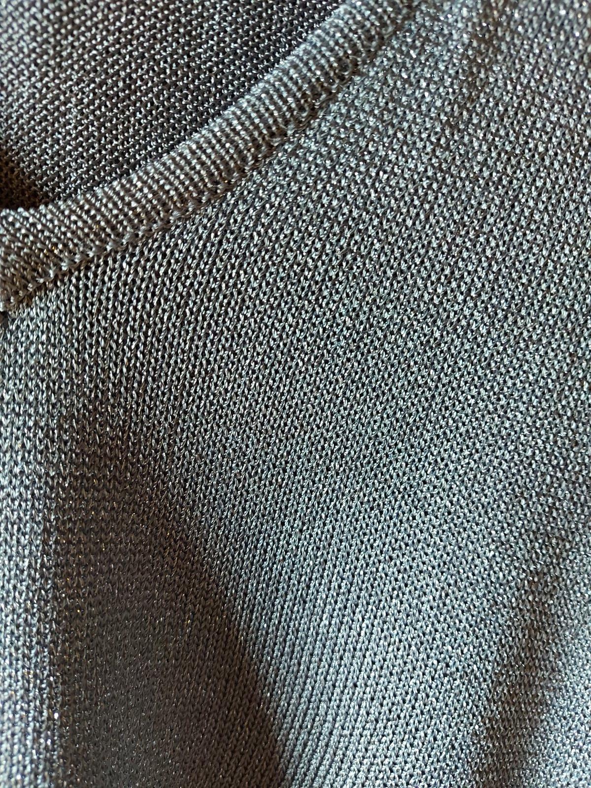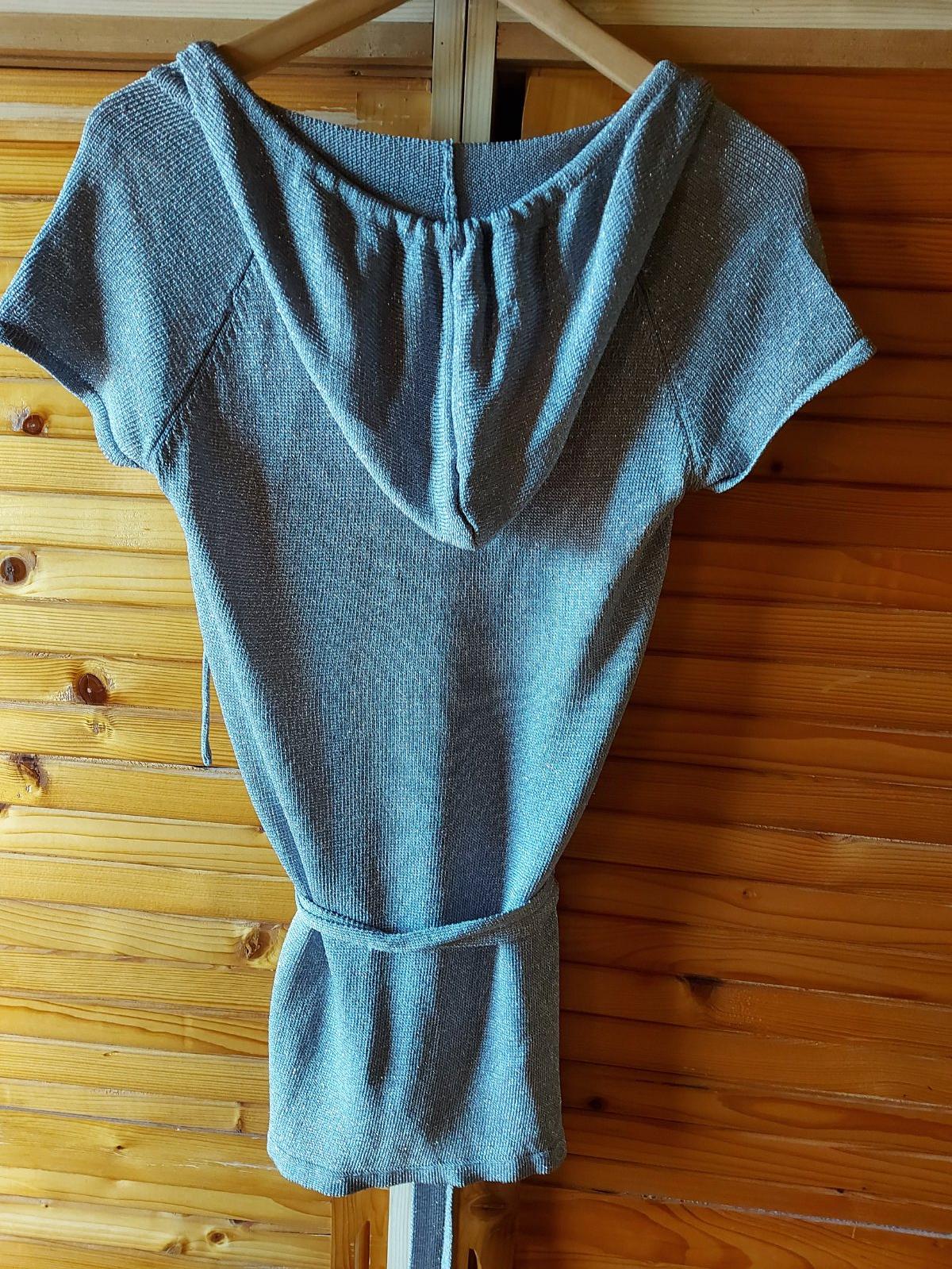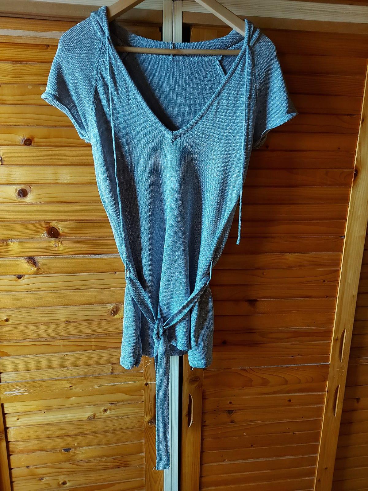 Strieborné tričko/tunika s krátkym rukávom, s kapucňou, vhodný na leto, v páse uväzovanie páskom-viď foto, š. pod pazuchami 38, d. zadného dielu 68, elastický materiál, niečo ako priadza