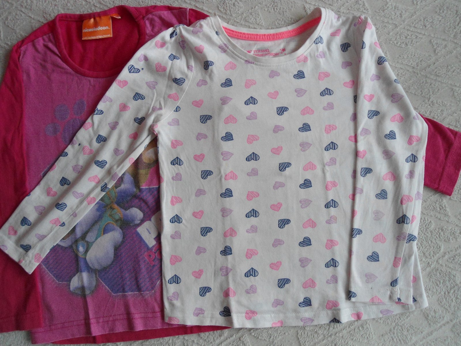 tričká vo výbornom stave, lapková patrola veľkosť 110, značka nickelodeon a biele tričko so srdiečkami - veľkosť 116 - značka young dimension.