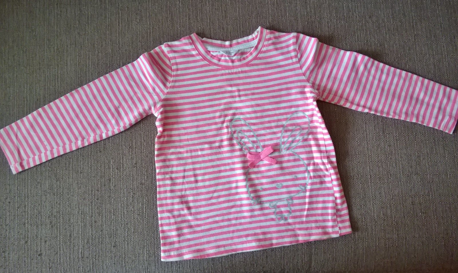Predám pekné elastické tričko z Pepca.Na tričku strieborný obrys zajka s mašličkou na uchu. Nosený len mojou dcérou. Bez dier a fľakov. Veľkosť cca 92-98.