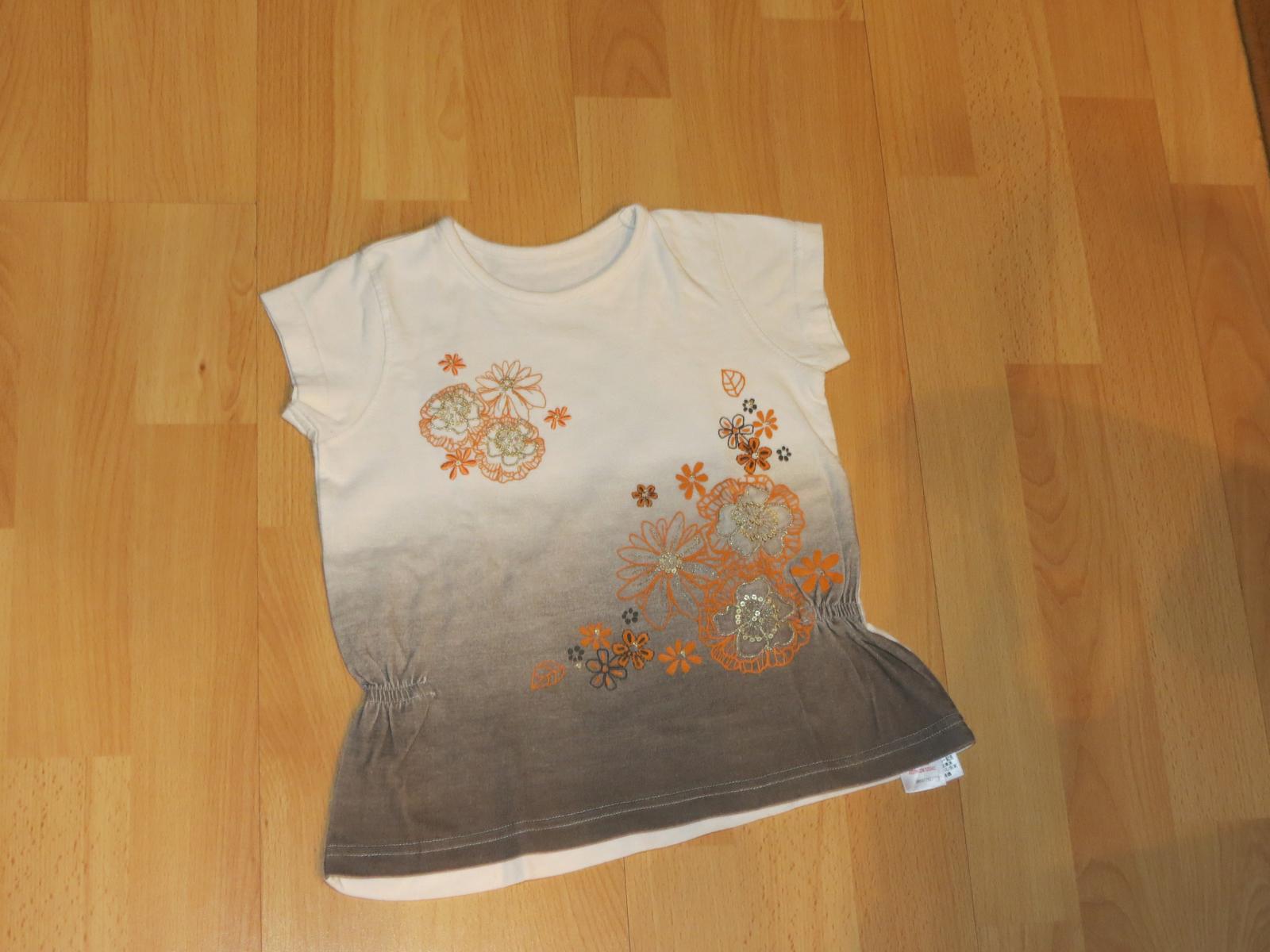 Tričko krémovo hnedej farby s krátkym rukávom, s oranžovou aplikáciou kvetiniek a s našitými flitrami, po bokoch mierne stiahnuté.