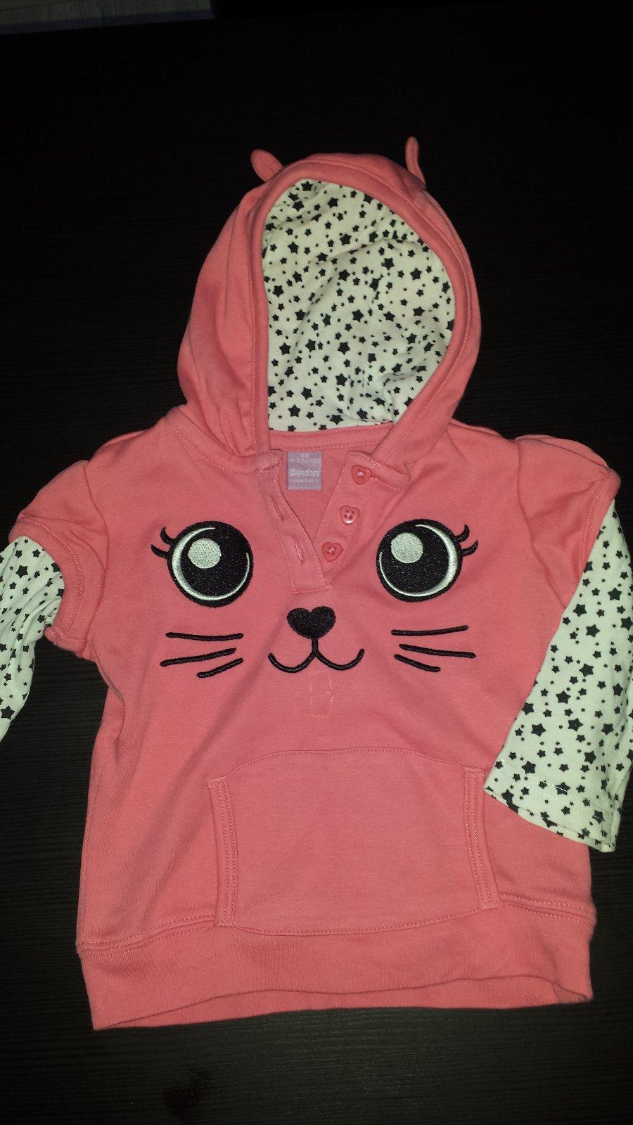 Predam dievcenske tricko s kapucnou s motivom macky. Na kapucni su uska. Tricko je malo nosene teda je vo velmi dobrom stave. Velkost 68 pisane 4 -6 mesiacov
