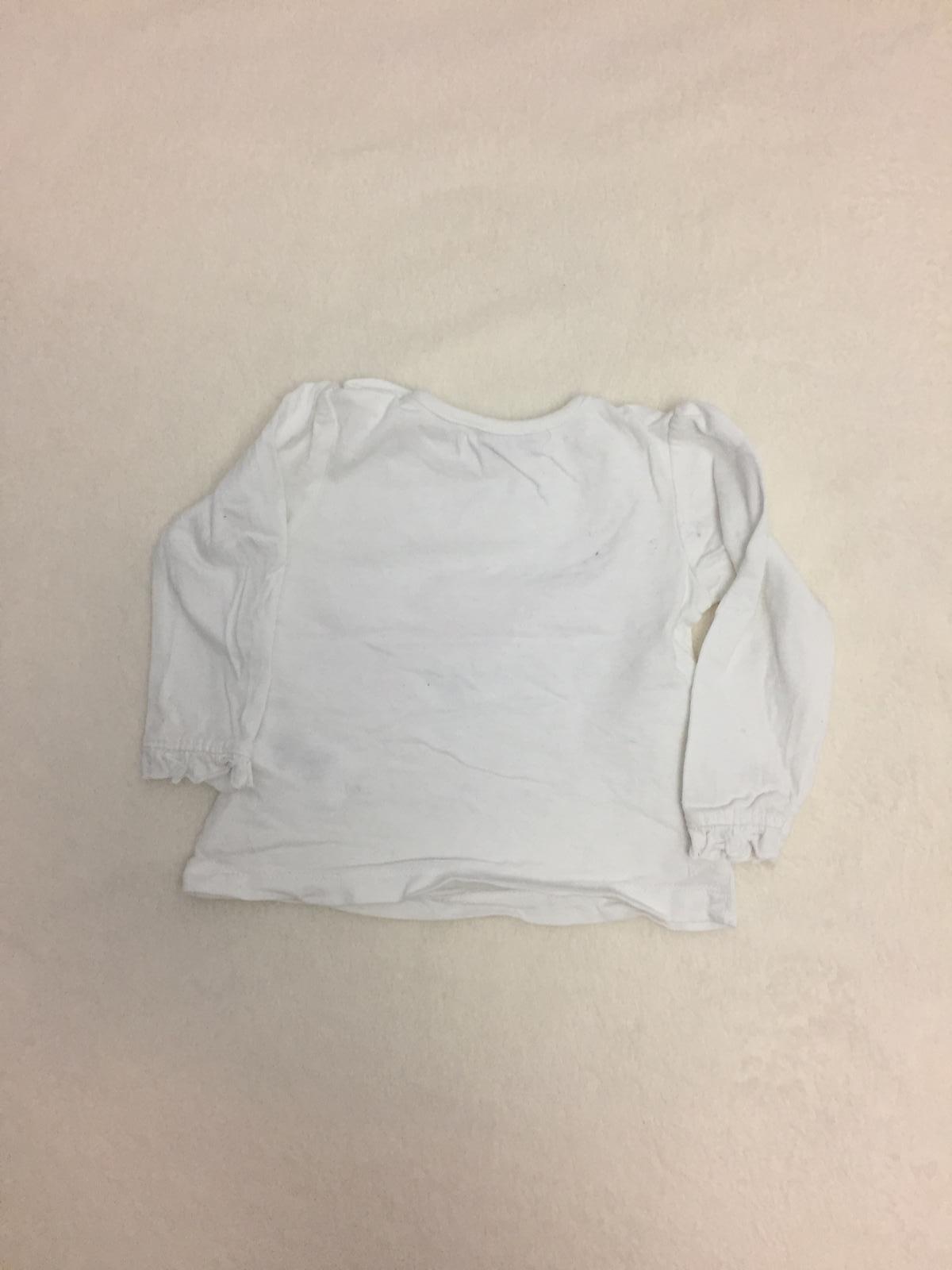 Nosené biele tričko pre malú princeznu. Veľkosť 56, 3-6mes. Farba je pekná biela, len na rukáve malá diera, viď.foto. K cene treba pripočítať poštovné.